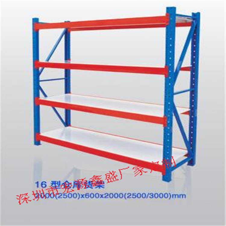 廉的特点。重型货架成本低、***、组装、拆卸简单方便的特点;适用于人工存取,每层标准有效承载800kg以上.适合于人工存取箱式货物,或者与零件盒、周转箱配套装载零散重型货物。