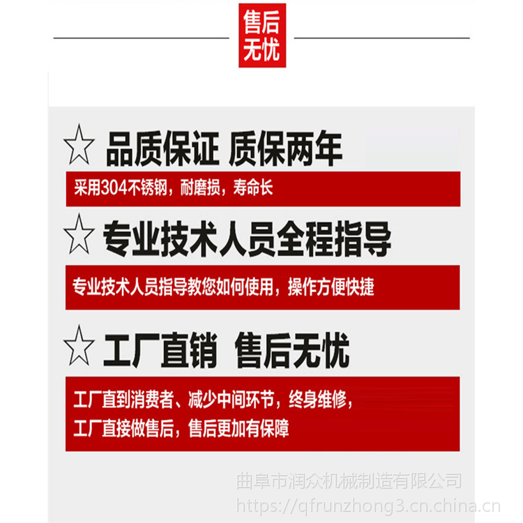 曲阜市润众机械制造有限公司坐落于孔子故里---山东省曲阜市,是专业从事畜牧养殖设备,工程,生物饲料再生资源的研究,养殖机械,农业机械等行业的生产研制、开发、生产和推广的现代生产技术及配套设备的养殖和农业机械制造厂!多年来,我厂家先后经营10余年来采购国家科研机构、社会各界的发明创造者合作,坚持“人无我有,人有我优,人优我精”的经营策略,秉承“以市场为准则,以新创科技为先导” “以德做人、以诚做事”,的经营理念,扎实地走科研与生产相结合的道路。先后推出: (1)农作物秸杆的综合利用配套设备;(2)中小型配合饲料;(3)畜禽多用颗粒饲料加工;(4)粮食深加工;(5)工程机械;(6)养殖设备等六大系列上百种规格的。主营产品:养殖场喂料车,养牛喂料车,喂牛撒料车,粪便脱水处理机,固液粪便分离机,自卸清粪车,抽粪三轮车,青贮取料机,铡草粉碎机,饲料颗粒机,饲料搅拌机,青贮打捆包膜机,谷物脱粒机,稻麦芦苇收割机,花生剥壳机,花生摘果机,多功能收获机,旋耕开沟机,除草割草机,家用吸粮机,装粮车载抽粮机,装卸车皮带输送机,断根起树机,绿化链条挖树机,种树打坑机,果树施肥挖坑机,大棚蔬菜播种机,多功能播种机,果园杀虫打药机,两用弥雾机,手推喷雾器,毛豆采摘机,板栗脱蓬机,开沟起垄机,履带式开沟机。 “润众”牌系列产品。常年来受到了各界的一致好评, “润众”每个员工坚持“质量铸就品牌”的企业宗旨致力于提升企业核心竞争力,铸造鲜明的企业文化,追求可持续发展 打造强势品牌,实现科技富民,产业报国之宏愿。 “润众”人热忱期待着您对公司给予更多的关爱和支持。 “润众”人热忱期待着您对公司给予更多的关爱和支持。 对于产品质量:我们要求精益求精! 对于服务:我们永远用微笑对待每位客户! 对于售后:我们用真诚的态度为每位客户分担!