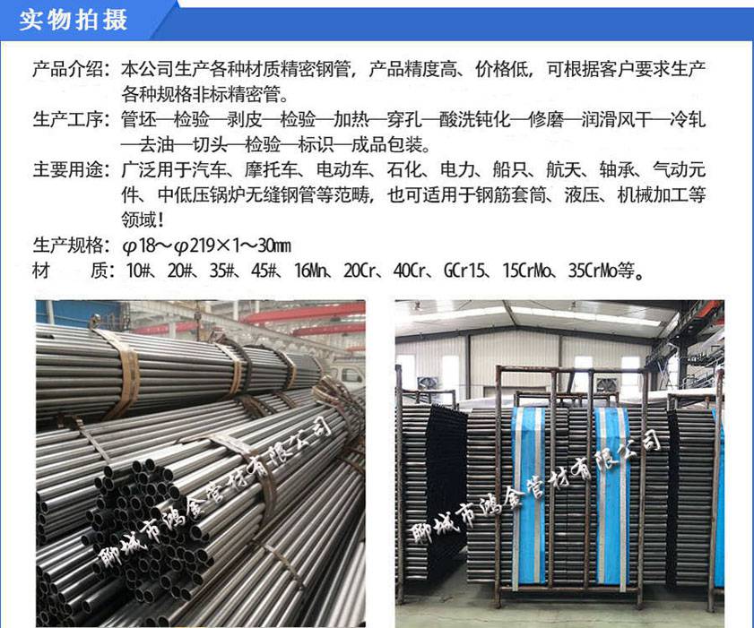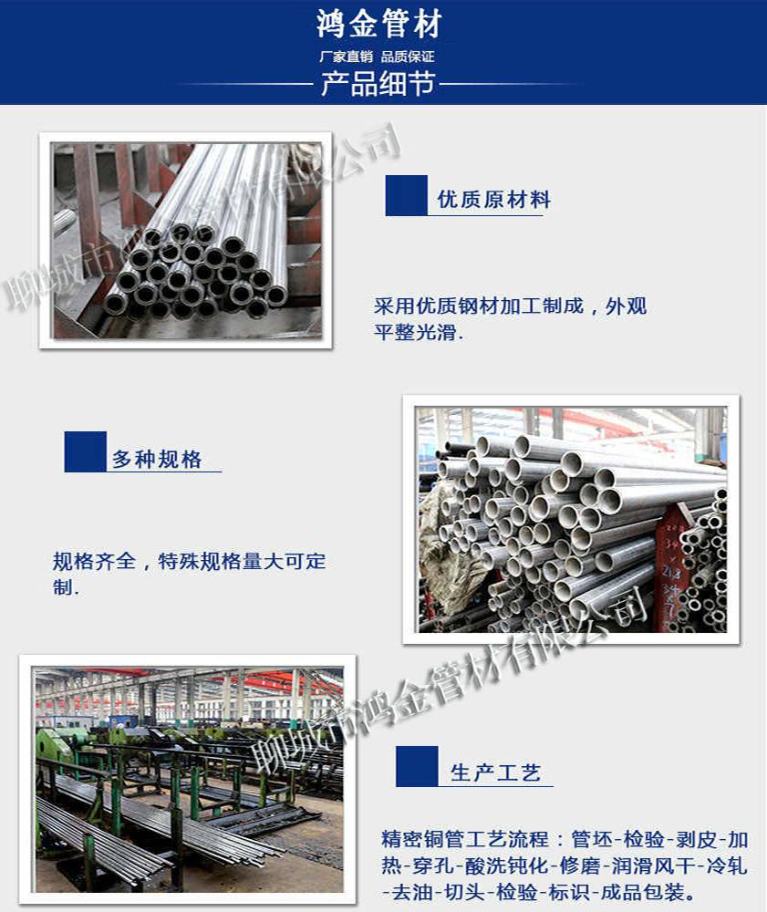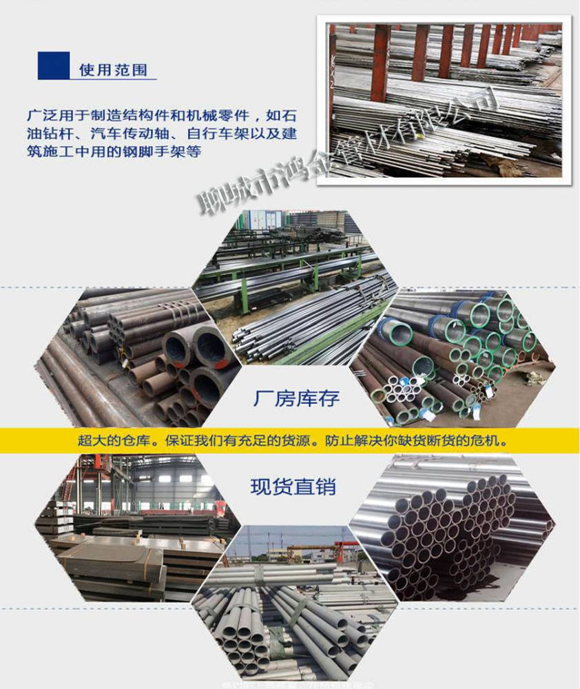 聊城市鸿金管材有限公司:是一家集钢材仓储、销售、运输于一体的大型现货销售企业,常年生产销售冷拔、热扎;薄、中、厚壁无缝钢管、合金钢管,精密钢管,品种齐全,库存量大,可定做非标及特殊钢种的不锈钢材,交货及时。