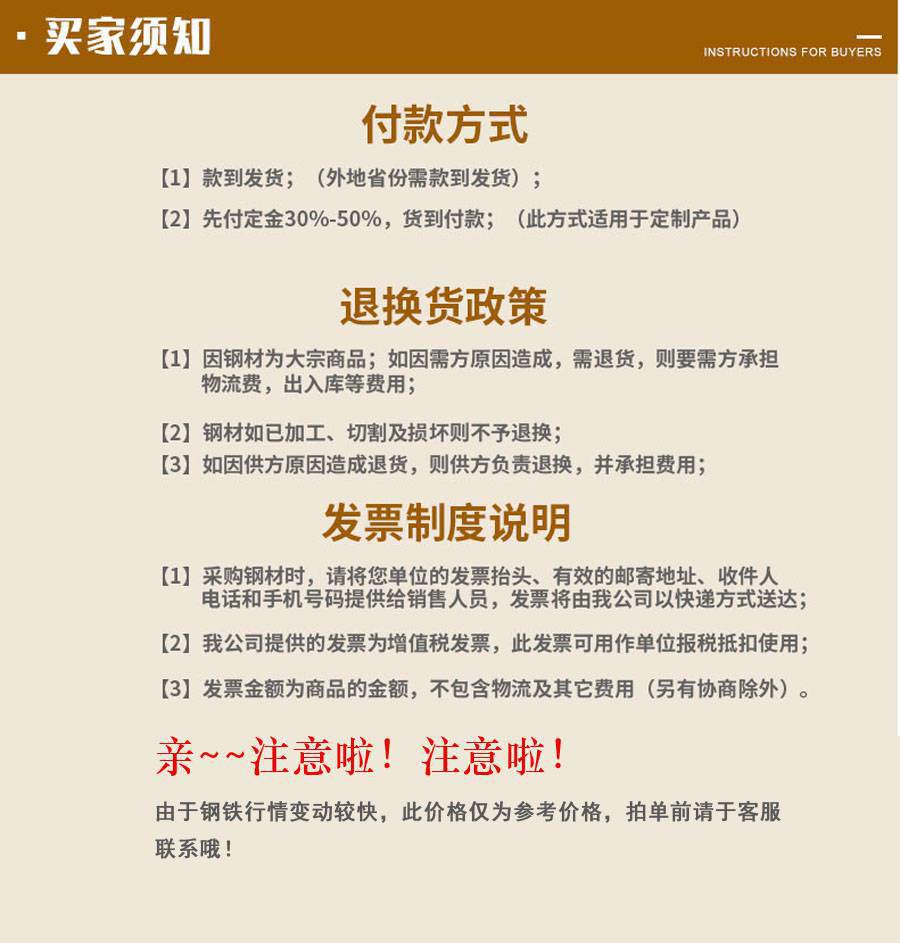 聊城市鸿金管材有限公司为了确保业务发展所需资源,与瑞典、舞钢、武钢、宝钢、涟钢、鞍钢、济钢、莱钢,济钢,东北特钢,兴澄特钢,长城特钢等各大钢厂建立了长期合作关系。所售板材的规格大体范围有长6米-12米,宽1.5米-4米,厚6mm-100mm,特殊规格可定扎。有色金属方面目前已经和西南,东轻厂家和经销商取得了合作的关系,弥补了各钢厂规格生产不全的缺陷,避免了客户采购奔波之苦。下属机械加工厂数控车间拥有***的自动化机械设备,主要有数控火焰切割机二台可代用户切割半成品及成品的钢板切割件。公司自成立以来始终坚持以市场为导向、以客户为中心、以质量为企业命脉、以诚信为治企之本、坚持认真严谨的原则稳步进取,不断发展壮大,在***确立了稳固的销售服务体系,并形成了覆盖华北、华南、乃至全国的销售网络,以良好的信誉、**的产品、雄厚的实力、低廉的价格享誉全国30多个省、市、自治区、直辖市,产品深得用户信赖。