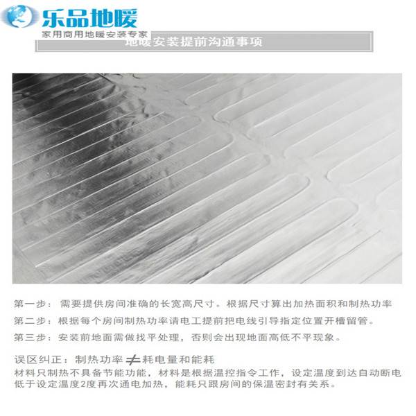 在使用房间比较多的家庭中,可以将不用的房间电热线电地暖关闭,有人活动的房间温度提高,避免浪费资源。铺设散热水管。盘管工艺是电热线电地暖施工验收的重点,因为它直接关系到采暖温度,太热或不暖等问题的根源都在这里。电热线电地暖系统的供暖原理为辐射传热,与空调、暖气等通过强制对流循环热风供暖相比,空气中灰尘流动要小的多,减少了空气中有害病菌的蔓延,室内环境更加卫生清洁。软水不易结垢,所以安装一台软水机,将自来水软化后再进入电热线电地暖管循环,能够大大降低能耗。
