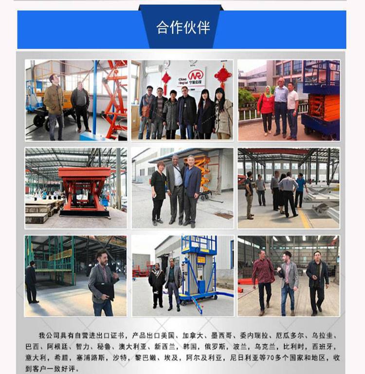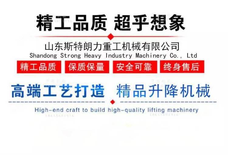 斯特朗力(山东)重工机械有限公司为液压升降机、升降货梯的专业生产厂家。成立于2004年,坐落于美丽的黄河北岸-山东省济阳区。经过多年拼搏奋斗,公司已经发展成为集生产、设计、研发和营销于一体的综合性实体企业。我们的产品包括自行剪叉式升降机,导轨式升降货梯,固定剪叉式升降机、铝合金升降机四轮移动式升降机、传菜机,残疾人升降机、拖车折臂式升降机、车载剪叉式升降机等。我们的举升高度可以从4米到30米;我们的承载能力可以从100公斤到100吨,我们的动力可以是电瓶、汽油机或柴油马达;设备可以人工拖动、机车拖动、电池驱动自行走、卡车装载移动。 我们的产品通过欧盟CE认证,得到中国进出口产品检验检疫局认可,成功通过SGS认证。我公司产品出口美国、加拿大、墨西哥,委内瑞拉、厄瓜多尔、乌拉圭、巴西、阿根廷、智力、秘鲁澳大利亚、新西兰、韩国、俄罗斯等70多个国家和地区,收到客户一致好评,享誉全球。