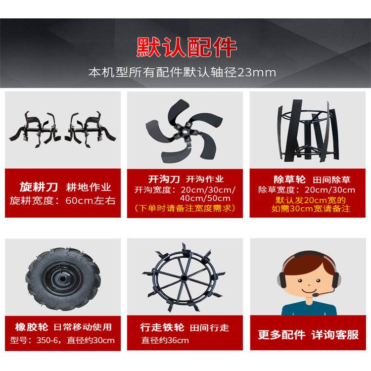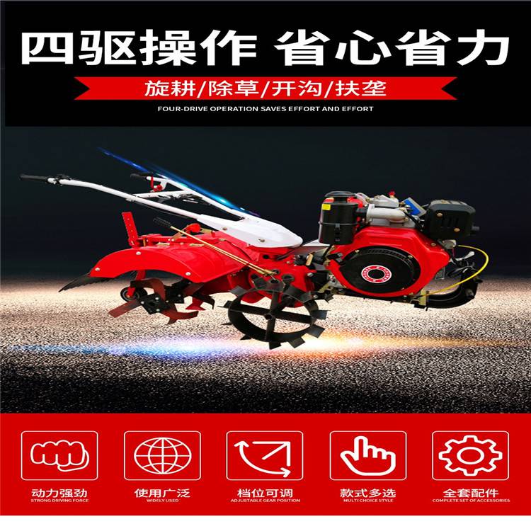 | 发动机:四驱水冷 | 功能:旋耕 除草 开沟 | 启动方式:手拉启动 电启动 |