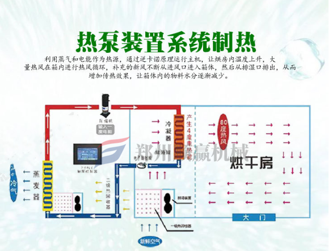 热泵烘干机是利用逆卡诺原理,吸收空气的热量并将其转移到房内,实现烘干房的温度提高,湿度降低,配合高温高湿轴流风机风机实现物料的烘干,烘干房由压缩机换热器(内机)节流器吸热器(外机)压缩机等装置构成了一个循环系统在内部循环流动。