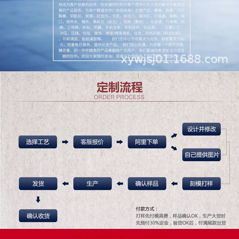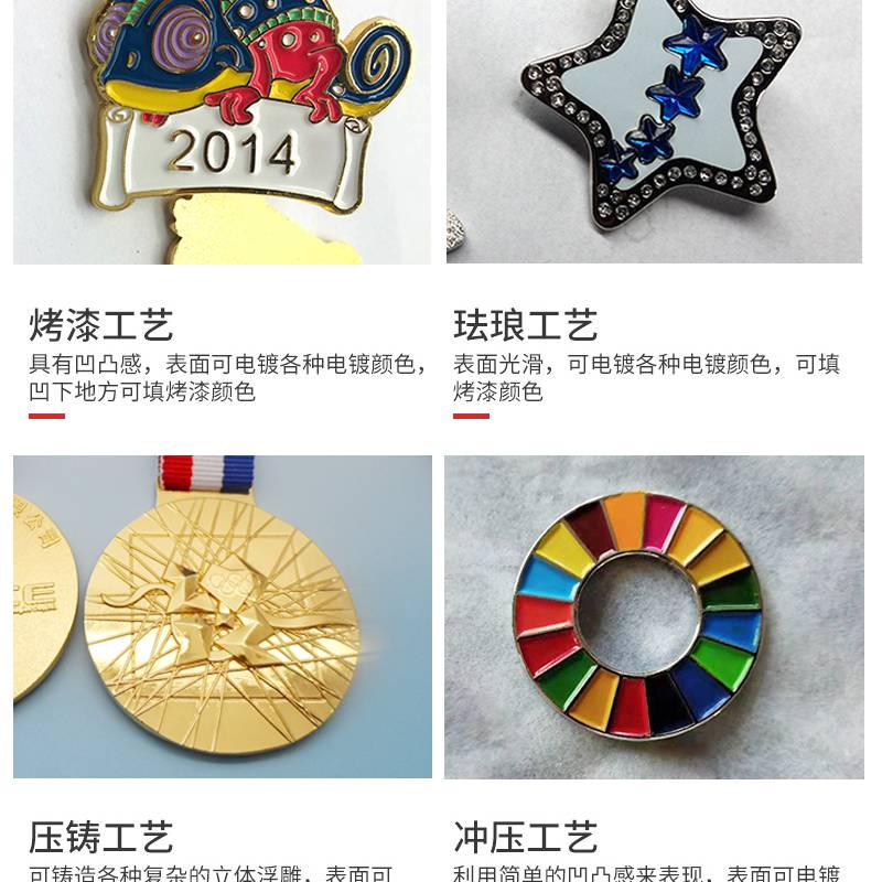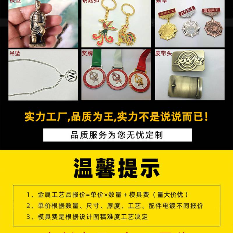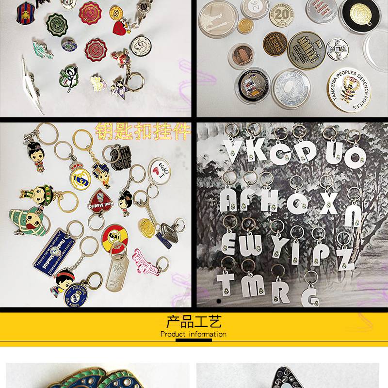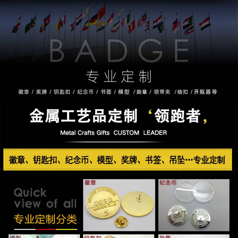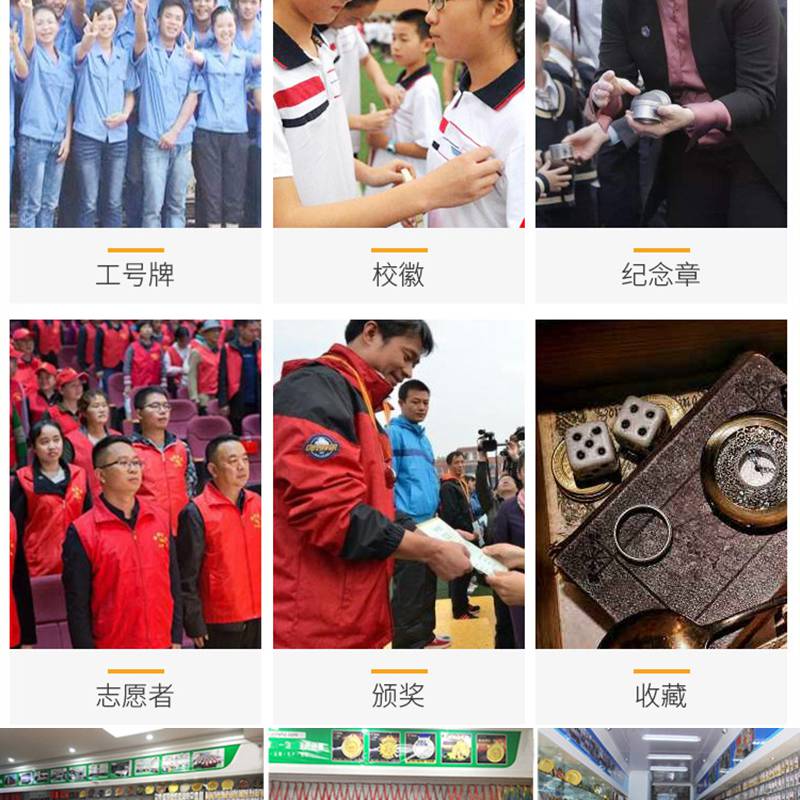 主营产品:徽章,勋章,闪光胸章,肩章,奖章,帽徽,校徽,钥匙扣,奖牌,书签,拆信刀,烟灰缸,开瓶器,相框,袖口,领带夹,帽夹,果岭叉(球叉),钱夹(票夹),化妆镜,行李牌,狗牌,工号牌,车标,挂包器,陀螺,手机支架,手机挂件,冰箱贴,杯垫,马口铁徽章,饰品等案台摆件。 主要工艺:冲压,压铸,咬版,腐蚀,烤漆/烤漆滴胶,珐琅,四色印刷(柯式印刷),印刷滴胶,贴纸滴胶等。我们坚持以市场需求为向导,顾客需求为动力,完善售后服务,提供优质产品。