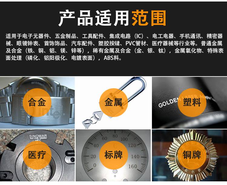 应用于电子元器件激光打码刻字、五金制品激光打标刻字、工具配件激光刻字、集成电路(IC)表面雕刻、电工电器激光打标、精密器械激光刻字、眼镜钟表激光打码、首饰饰品激光刻字、汽车配件激光打标、塑胶按键激光打码刻字、PVC管材激光打标、医疗器械等行业激光打标刻字。金属及合金(铁、铜、铝、镁、锌等)激光打标刻字,稀有金属及合金(金、银、钛)、金属氧化物特殊表面处理(磷化、铝阳极化、电镀表面),ABS料激光打标刻字等。