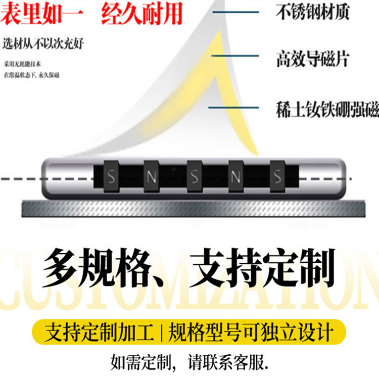 无能耗、***、可安装于生产线上能与物料接触的任意位置,节约空间,安装方便,磁棒采用稀土合金钕铁硼作为磁源,磁力强劲,结构简单,使用寿命长,规格样式可按照客户使用要求及生产现场情况任意更改定制。