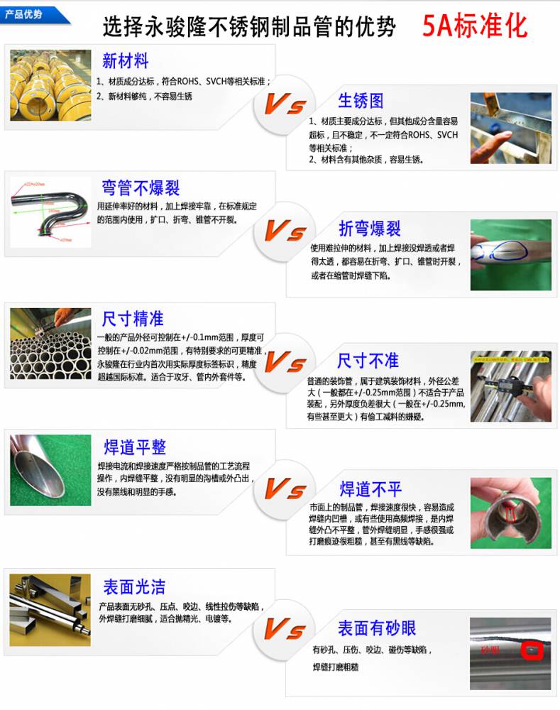 佛山市永骏隆不锈钢有限公司专注于不锈钢制品管、不锈钢厚壁管、不锈钢工业焊管、不锈钢薄壁管、不锈钢家具管、不锈钢卫浴管、不锈钢装饰管等产品的生产加工,公司拥有近10年不锈钢焊管的生产经验,管理完善,生产技术成熟,产品质量稳定,确保我们的管材令客户认可、满意,这就是我们企业的使命。 本企业生产的不锈钢管,采用达标原材料,生产的不锈钢管材,光泽度强、美观、坚固耐用,广泛应用于各种高难度异形、打锥、扩口、深拉弯等加工品,因此本公司一直倍受家具、拉手、卫浴、建筑装饰等行业的供应商青睐。而且公司可根据客户的要求生产不定尺、非标管材或者其他材质的不锈钢管,产品种类丰富,多样化满足各行业客户的不同需求,客户的要求就是我们不断的追求。 企业理念: 品质承诺:***质量、***数量、***交货期 经营原则:诚信互惠,长久合作 企业精神:团结拼搏、敬业奉献、务实求新 服务理念:顾客至上、专业服务 产品优势: 【材质达标】原材料成分达标,符合国家***标准GB18705-2002,材质纯净,不含其他杂质,不容易生锈 【优质表面】表面光亮,无砂眼,无砂孔,无黑点,无裂缝。 【焊道平整】焊接电流和焊接速度严格按照制品管的工艺流程操作,内焊缝平整,没有明显的沟槽或外凸出,没有黑线和明显的手感。
