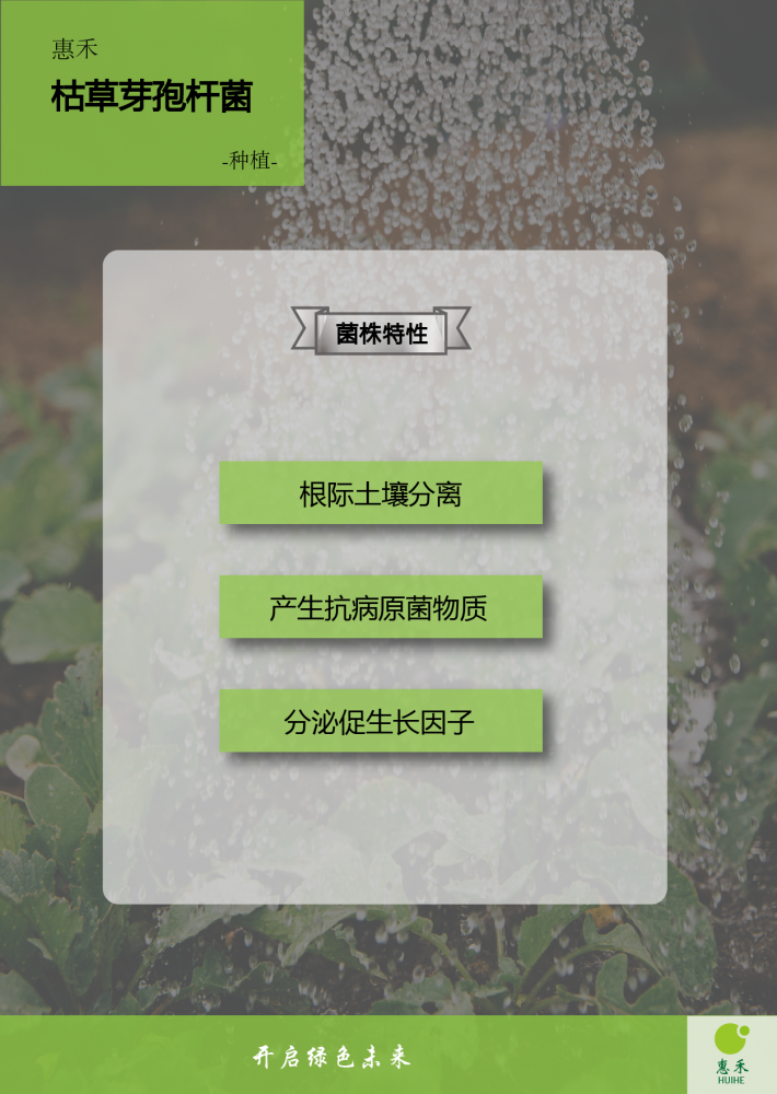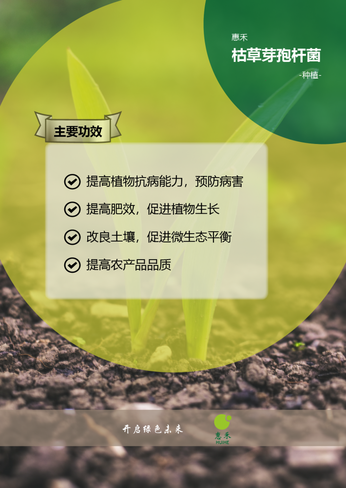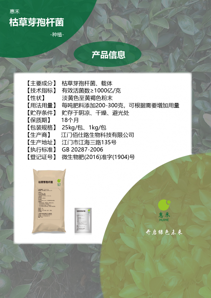 | 主要成分:枯草芽孢杆菌 | 含量≥:1000亿/克% | 适用范围:肥料添加、植物护理 |