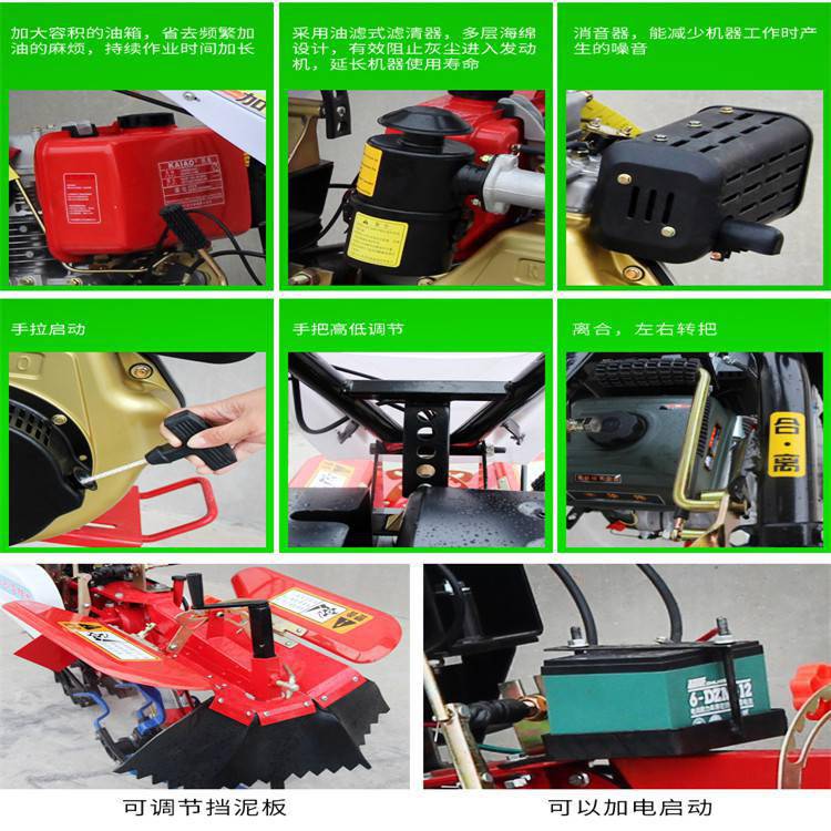 10、小巧灵活:机器宽度50厘米以上,高90厘米,长1.4米,重80-100公斤,非常小巧灵活,省事。11、适用性强:适用山地,丘陵、平原、旱田、水田、大棚、果园等。
