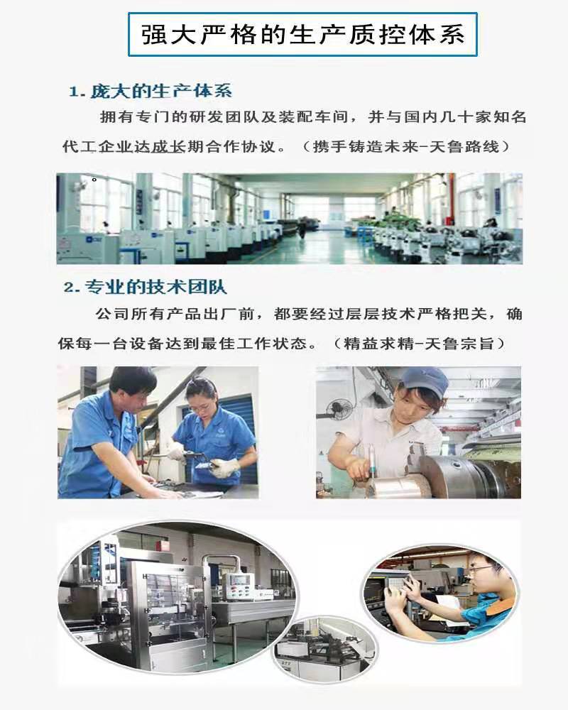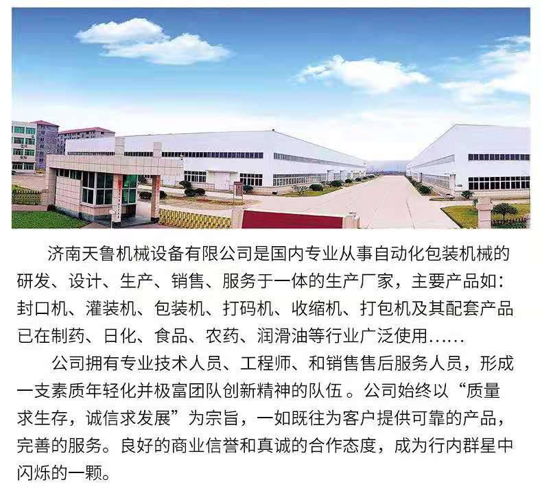 济南圳鲁机械设备有限公司(济南天鲁机械子公司)是专业生产包装机械的厂家,主要产品有:自动液体灌装线、自动膏体灌装线、自动粉剂灌装线、自动颗粒灌装线、全自动袋装液体包装机、全自动袋装膏体包装机、全自动袋装粉剂包装机、全自动袋装颗粒包装机灌装机、封口机、打包机、收缩机、打码机、锁口机、旋盖机、折纸机、贴标机、喷码机、封尾机等数十种包装机产品,广泛应用于食品、医药、日化、五金等行业。 圳鲁(天鲁)通过多年的行业经验积累拥有高***的技术人才,拥有高素质的工作团队,可以及时地为客户提供完善的售后服务。“专业资格,打造品牌”是圳鲁的经营目标,“***质量,信赖价格”是圳鲁的经营宗旨。圳鲁在包装机械领域拥有人才、资源、网络、规模、经验的巨大优势和影响力,成为具有高度竞争力和***性优势的全新创业组织。 本公司以质量求生存,以服务求发展,始终以重合同、守信用为宗旨,设备质优价廉,欢迎广大新老客户来厂选购! ——圳鲁机械,铸造***品质,***包装行业