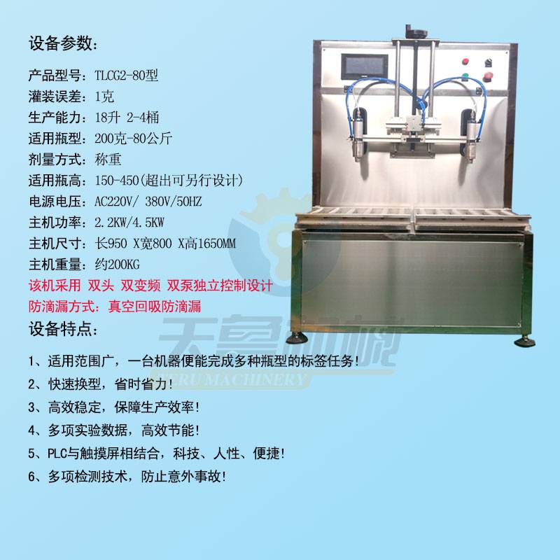 TLCG系列电子称重式液体灌装机,是我厂自主开发与生产的一种,专门适合液体大包装的灌装机械。本设备不同与其他定量灌装设备,采用***的电子称重的方式进行定量,因此大大提高了灌装的精度与速度。另外,机身内外绝大部分零件采用不锈钢制造,既耐用又卫生,长时间工作性能可靠稳定。本设备性能优良、质量***、价格低廉,是油脂、石油、化工等行业理想的灌装设备。