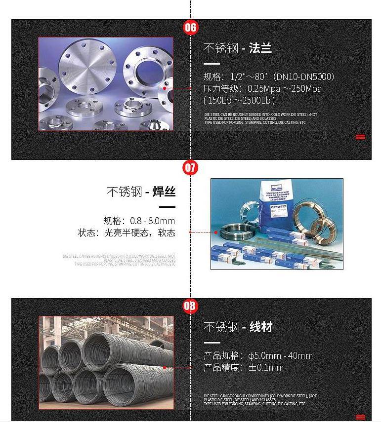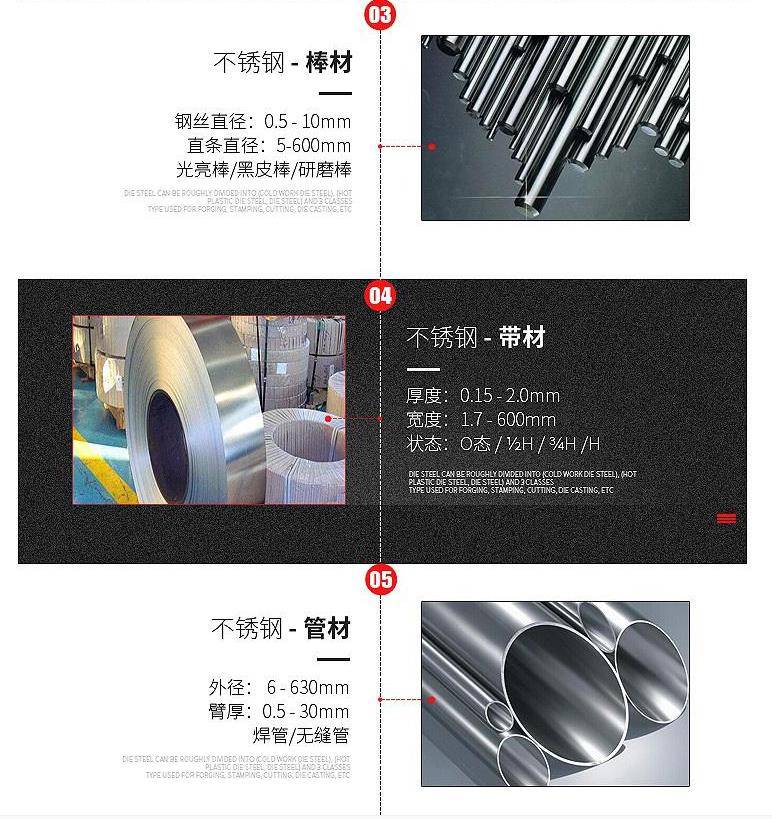 公司主要以经营201、202、304、304L、316L、316Ti、321、309S、310S、及410、420、430、444、443、409L、904L等材质为主的各种规格不锈钢板、卷材、线材、不锈钢管材,同时兼营各类型材,代理经销太钢、宝钢、张浦、大庚等不锈钢板,并且生产加工不锈钢管和不锈钢型材,大口径的不锈钢管和薄壁管等都可以接受定做。恪守求真务实、质量至上的宗旨,沿着化、集中化、规模化的发展战略方向,创造用户满意的高附加值产品,用优良的产品、成熟的销售团队、完善的售后服务满足您的需要,我们相信会用完善的服务和产品质量赢得您的信赖和满意,能与各界朋友携手共谋发展、共创美好未来