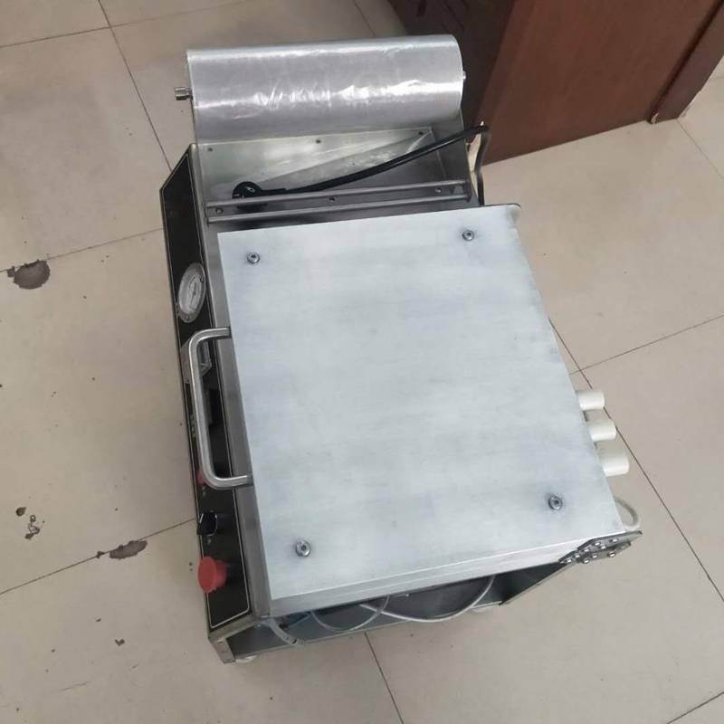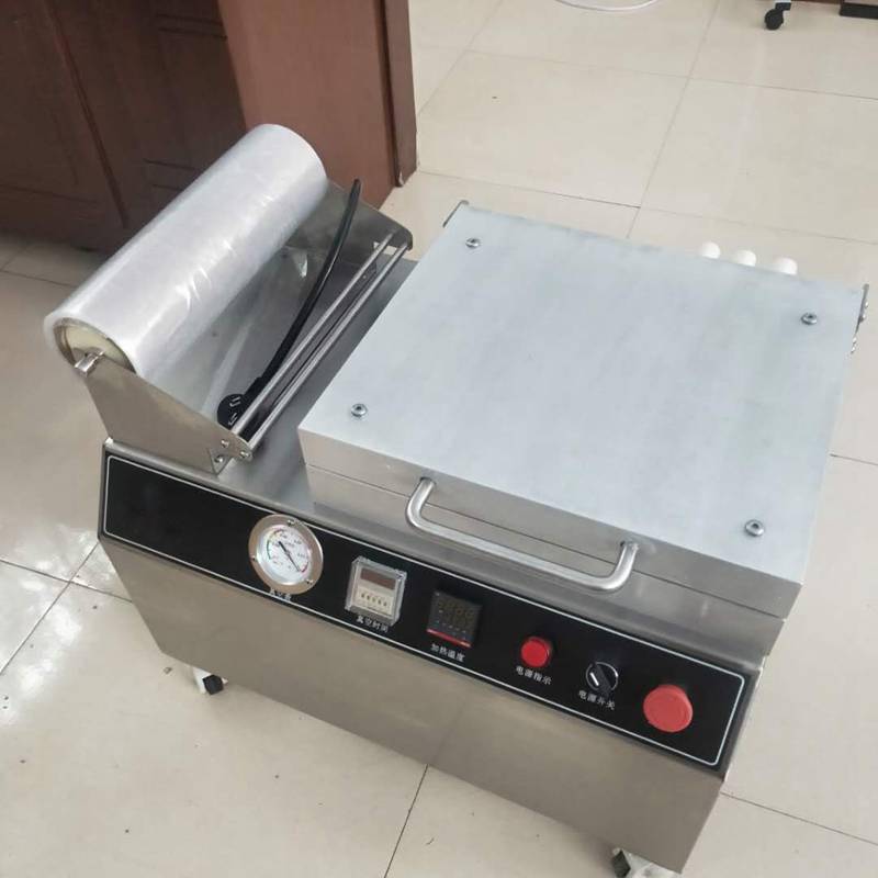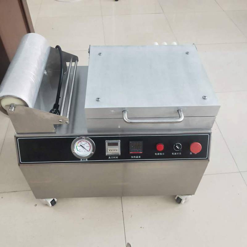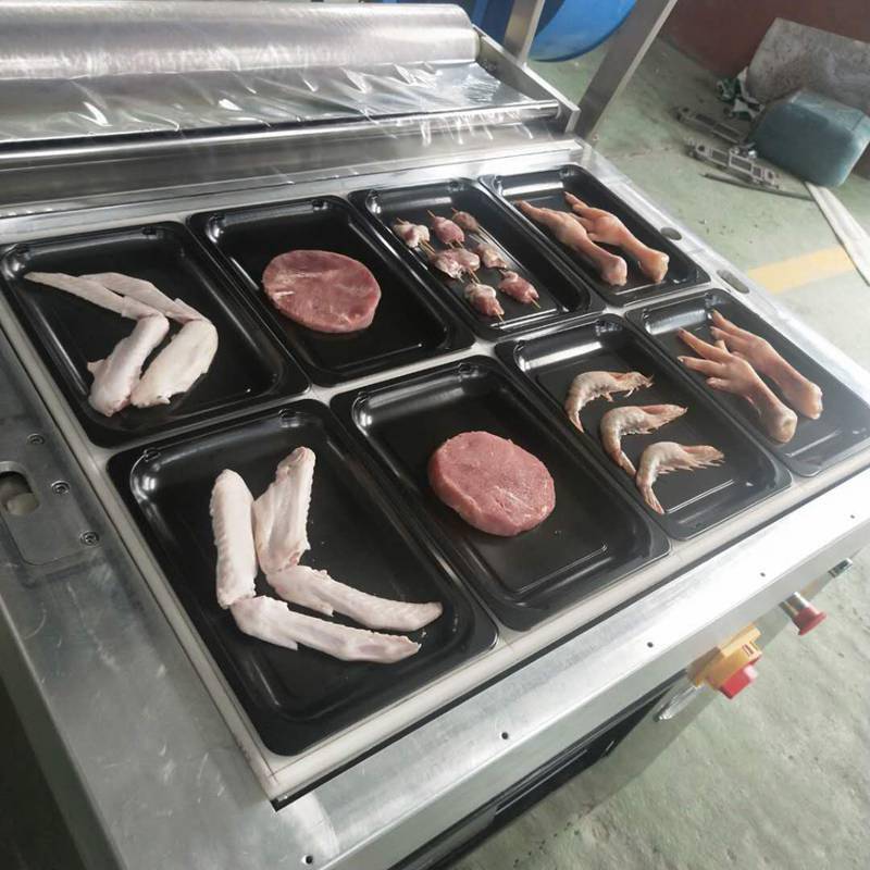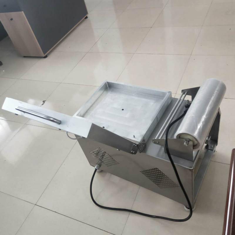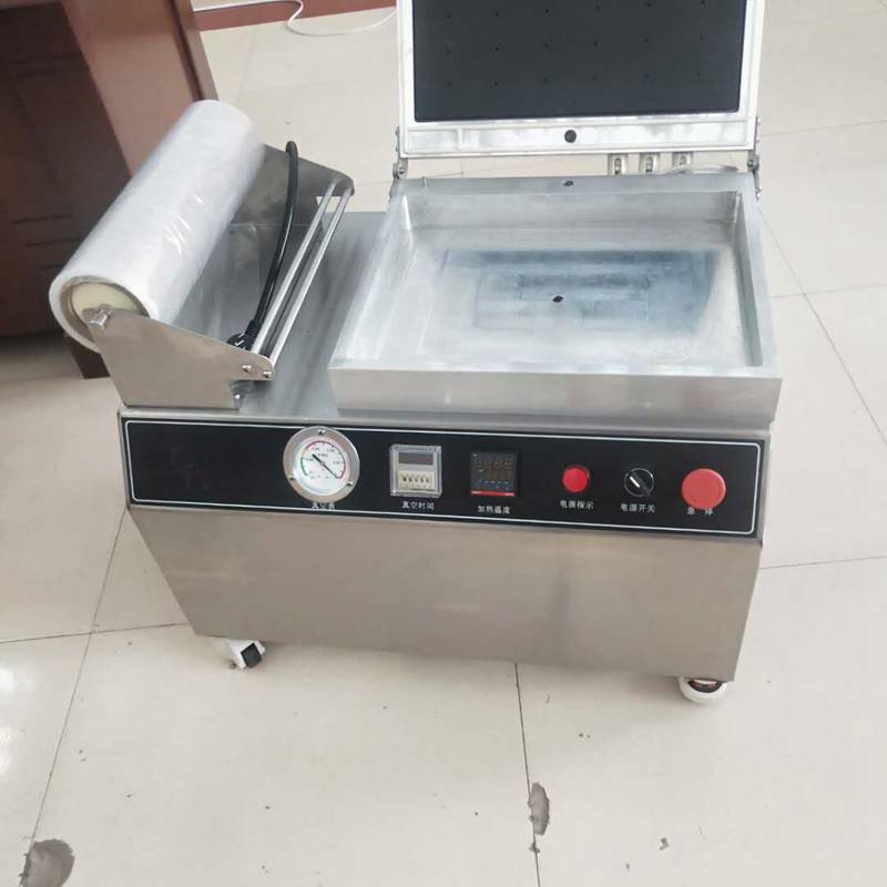 现货小型牛肉贴体真空包装机 猪肉贴体包装机 羊肉小型贴体包装机真空贴体包装机的原理是:采用低粘度的复合膜,将物料放在下模板的托盒或膜上,在真空状态下,将加热板产生的热量通过排风口送到真空室内,给低粘度复合膜瞬间通体加热,复合在一起,达到真空包装的效果。