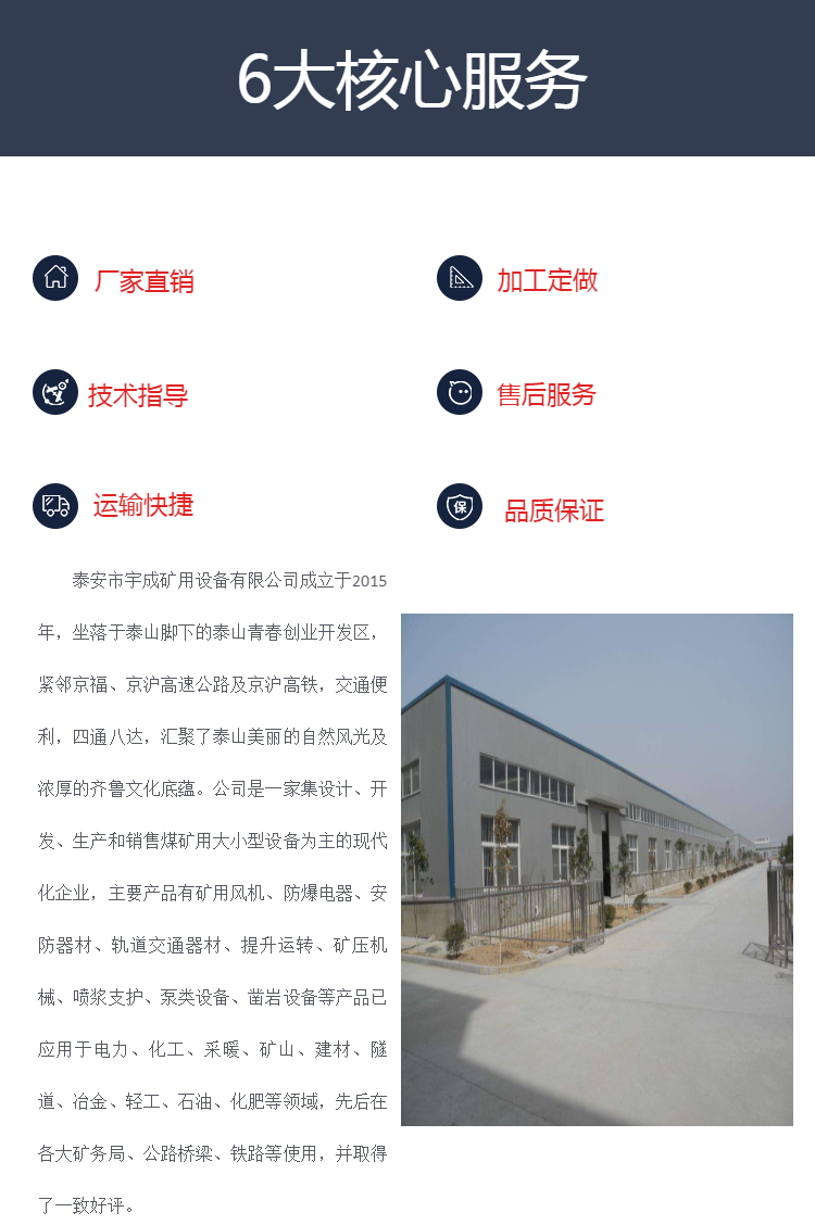 泰安市宇成矿用设备有限公司成立于2015年,坐落于***泰山脚下的泰山青春创业开发区,紧邻京福、京沪高速公路及京沪高铁,交通便利,四通八达,汇聚了泰山美丽的自然风光及浓厚的齐鲁文化底蕴。公司是一家集设计、开发、生产和销售煤矿用大小型设备为主的民营企业,产品已广泛应用于:神华集团、兖州煤业、大同矿业、枣矿集团、新汶矿业集团、永煤集团、焦煤集团、平顶山煤业矿业集团、靖远煤业等***矿区百余座煤矿,并取得了重要成果。 泰安市宇成矿用设备有限公司秉承“规范、科学、创新”的企业特色,以“宇量胸怀、成就未来”为座右铭,以始终***“一切以用户为中心,了解用户、满足用户、顾客驱动,合作共赢”以及“同等质量比价格,同等价格比服务”的***管理理念,为客户提供完善的售前、售中、售后一体化服务,我们相信诚实正直、***进取地为公司发展做正确的事情,将为公司和个人带来共同的利益和进步,经过不断的努力和超越已经成为一家在***具有相当规模、较大影响力、发展迅速的企业之一。 公司坚持“以质为钢,以诚为本”的基本宗旨,“诚实守信,精益求精”作为我们的经营理念,愿同各行各业有志之士真诚合作,携手共进,共创辉煌明天。