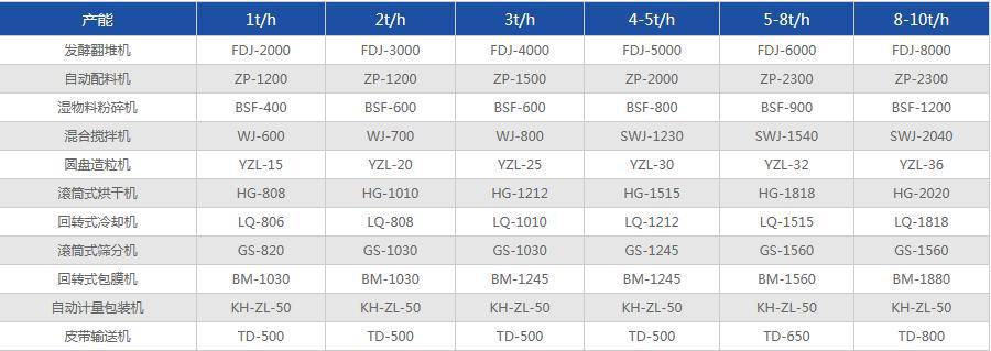 低配置:固定发酵翻抛机、半湿物料粉碎机、卧式搅拌机、造粒机、滚筒筛分机、包装设备。