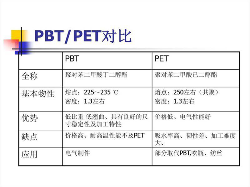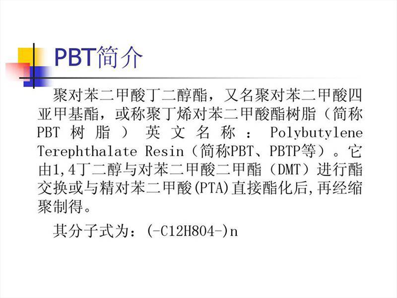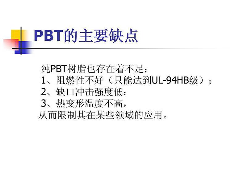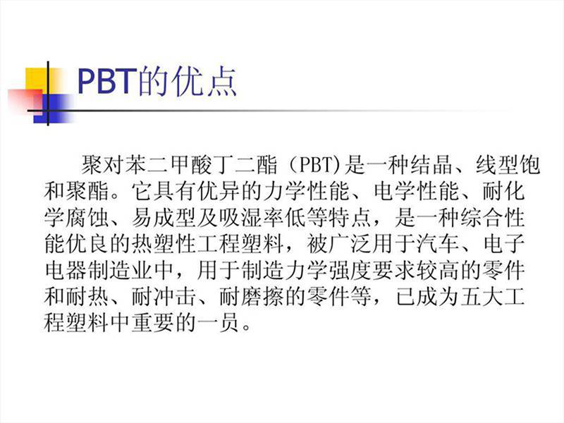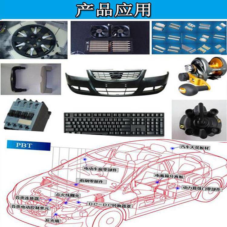 PBT 缺点是缺口冲击强度低 ,成型收缩率大 。故大部分采用玻璃纤维增强或无机填充改性,其拉伸强度、弯曲强度可提高一倍以上,热变形温度也大幅提高。可以在140℃下长期工作,玻纤增强后制品纵、横向收缩率不一致,易使制品发生翘曲。PBT 结晶速度快,***加工方法为注塑,其他方法还有挤出、吹塑、涂覆和各种二次加工成型,成型前需预干燥,水分含量要降至0.02%。PBT(增强、改性PBT)主要用于汽车、电子电器、工业机械和聚合物合金、共混工业。如作为汽车中的分配器、车体部件、点火器线圈骨架、绝缘盖、排气系统零部件、摩托车点火器、电子电器工业中如电视机的偏转线圈,显像管和电位器支架,伴音输出变压器骨架,适配器骨架,开关接插件、电风扇、电冰箱、洗衣机电机端盖、轴套。另外还有运输机械零件,缝纫机和纺织机械零件、钟表外壳、镜筒、电熨斗罩、水银灯罩、烘烤炉部件、电动工具零件、屏蔽套等。