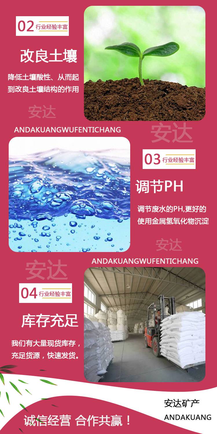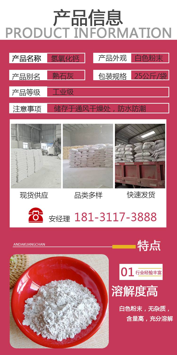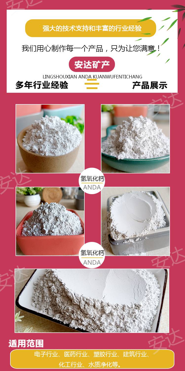 本页信息为灵寿县安达矿物粉体厂为您提供的"工业级氢氧化钙干燥剂用石灰粉氧化钙95含量路建用安达供应"产品信息,如您想了解更多关于"工业级氢氧化钙干燥剂用石灰粉氧化钙95含量路建用安达供应"价格、型号、厂家请联系厂家,或给厂家留言。 进入店铺