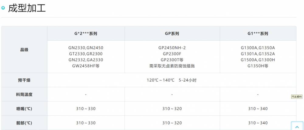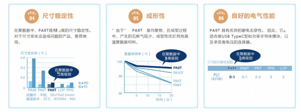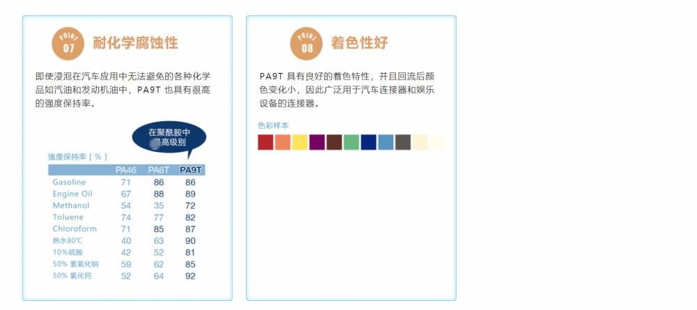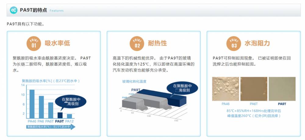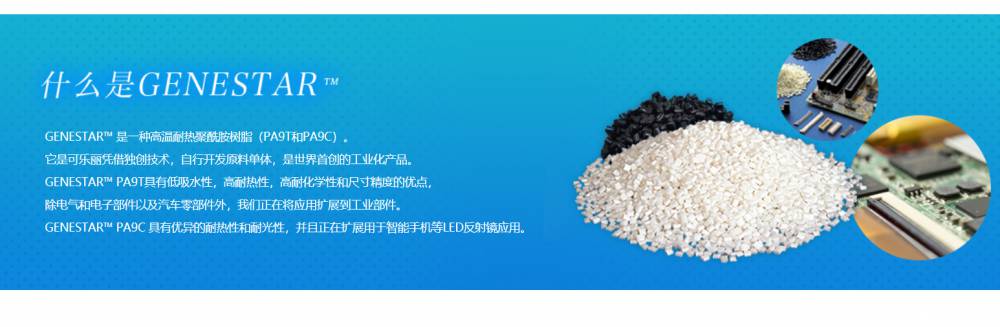 性能在一些主要方面超过标准尼龙,其优点包括:在干燥和潮湿下提供相同的强度和韧性,与标准尼龙相比,在更高的温度下仍然保持***强度和韧性。易于加工----良好的流动性,热稳定性和较低的模具腐蚀性;具高热稳定性及高润滑性之高性能尼龙,低吸水率(1%,其它常见高温尼龙为2.6%以上)﹑低翘曲﹑耐化学品﹑高尺寸稳定性材料,可于0.75mm厚度下达到94V-0之效果。PA9T的玻璃化温度较高(125℃)和高结晶性使其在高温下仍保质良好的韧性,优于PA66和PA46,耐摩性和摩擦系数小都大大优于其它尼龙,甚至超过POM和LCP。PA9T另一个***的性能是耐化学品和油、醇、酸和二氯化钙、热水和其它流体,几乎超过所有PA,仅比PPS略差,而对燃油的阻隔性是PA6和PA12的十倍,接近ETFE(乙烯-四氯乙烯共聚物)水平,这些优良性能使PA9T十分适用于汽车机罩制品。PA9T有不含玻纤及含玻纤(33%, 45%, 50%)和防火等规格,对于汽车机罩、电气电子产品等市场应用***发展潜力。