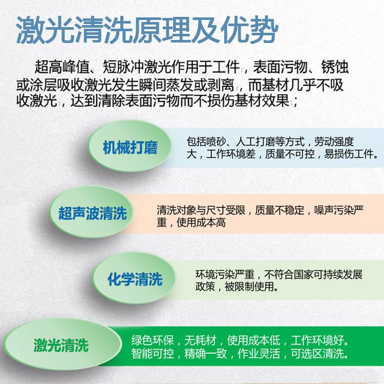 激光清洗是未来工业清洗的发展趋势。在超高峰值、短脉冲激光作用下,工件表面污物、锈蚀或涂层吸收激光发生瞬间蒸发或剥离,而基材几乎不吸收激光,达到清除表面污物而不损伤基材效果。绿色环保,无耗材,使用成本低,工作环境好。 智能可控,效果一致,作业灵活,可选区清洗。