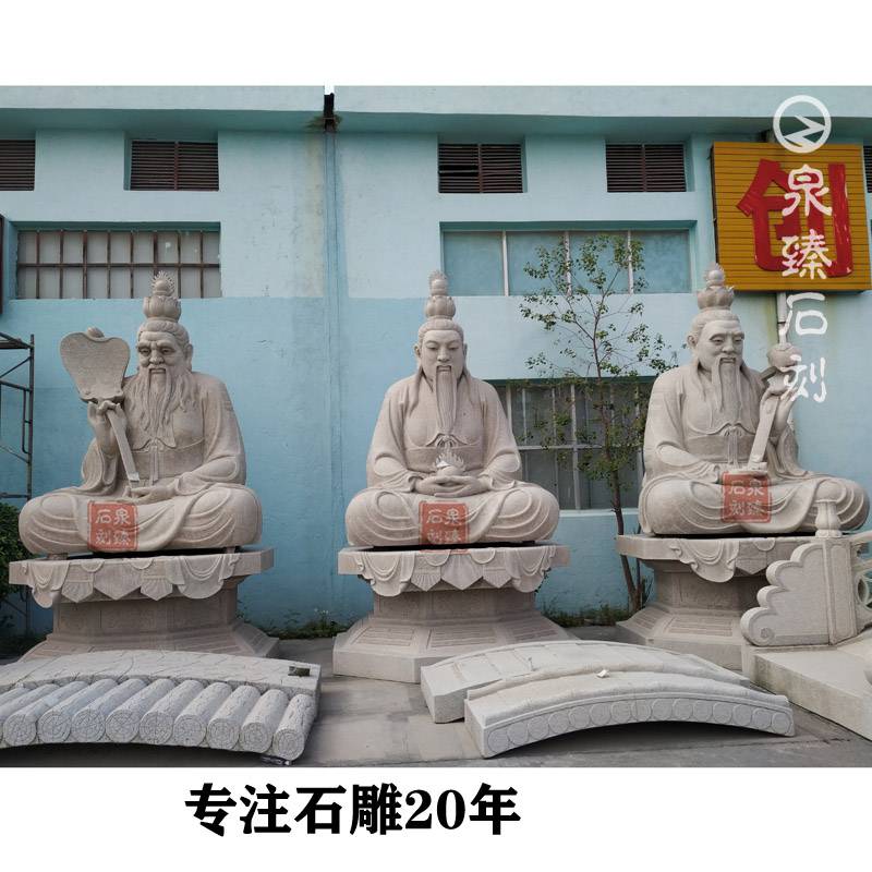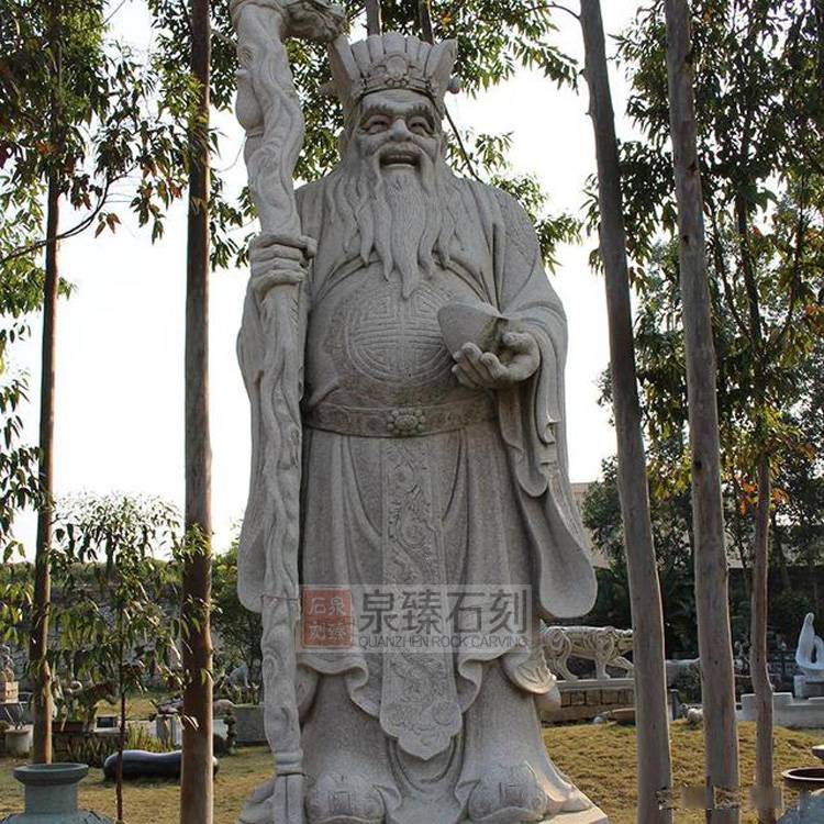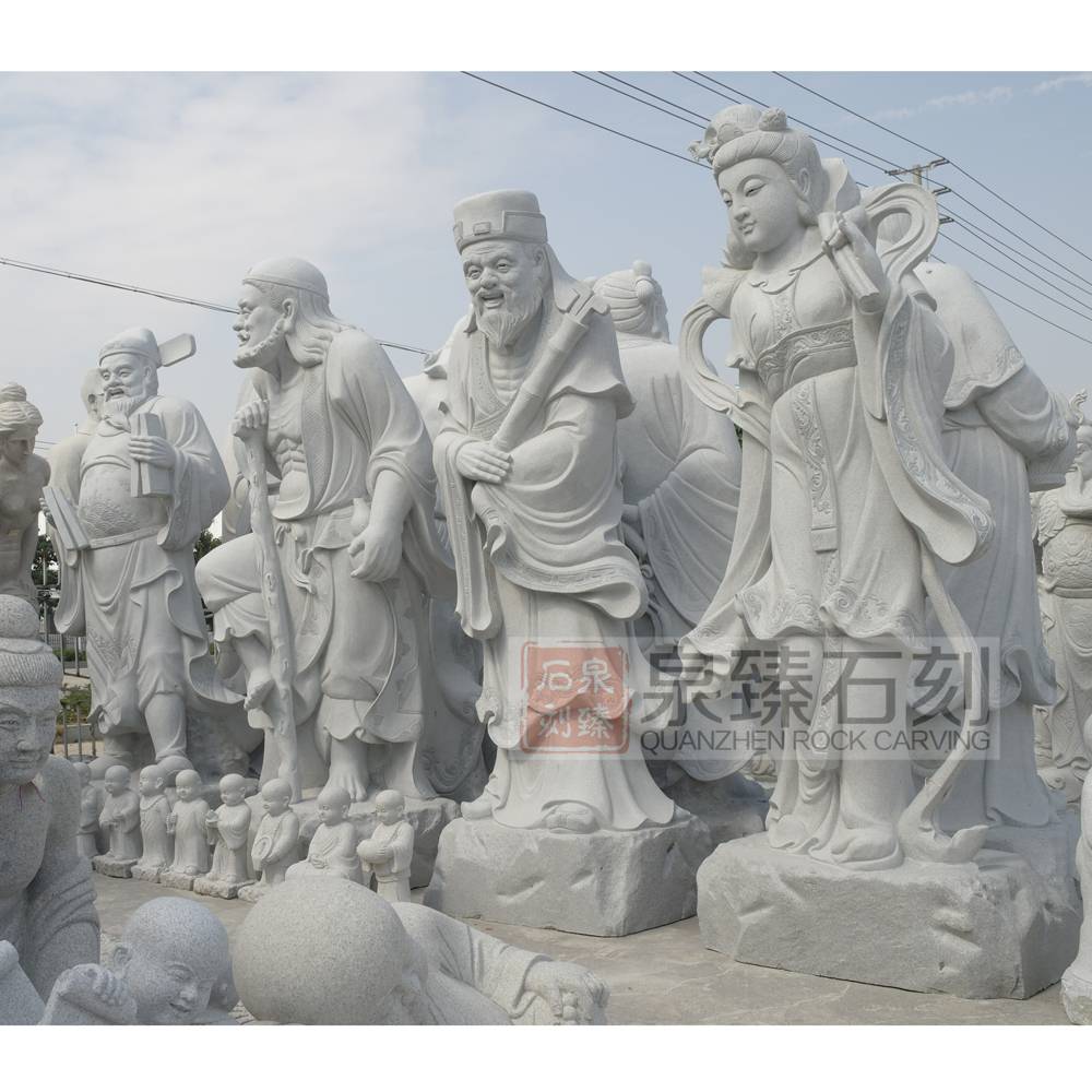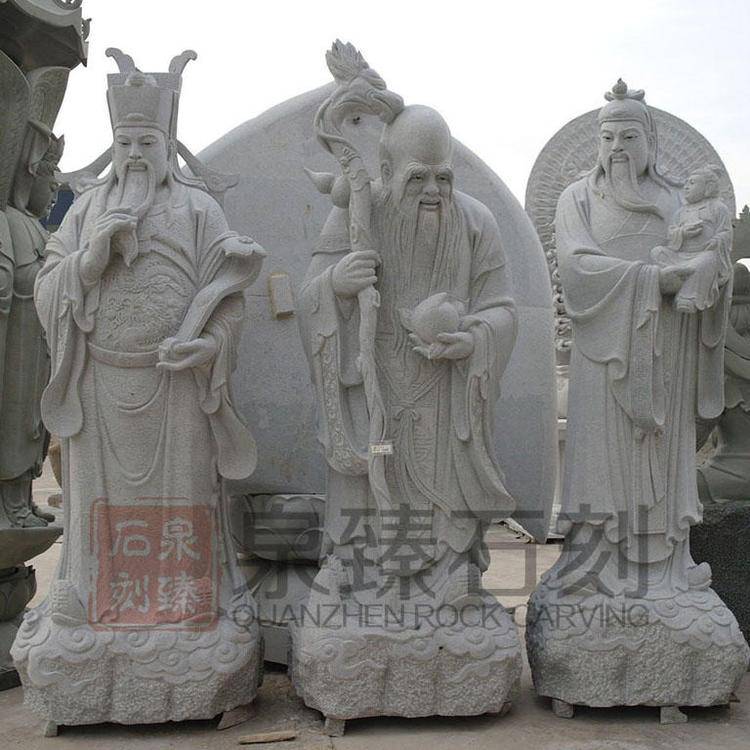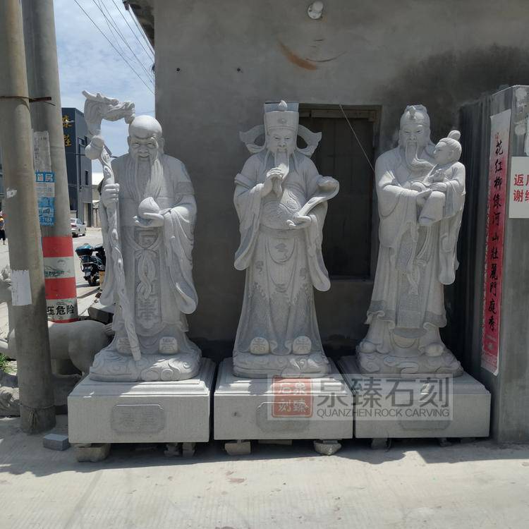 石雕福禄寿三星:“福星”手抱小儿,象征有子万事足的福气。“禄星”身穿华贵朝服,手抱玉如意,象征加官进爵,增财添禄。“寿星”手捧寿桃,面露幸福祥和的笑容,象征安康长寿。石雕福禄寿三星中,本来只有“禄星”才是财神;但因为三星通常是三位一体,故此福、寿二星也因而被人一起视为财神供奉了。