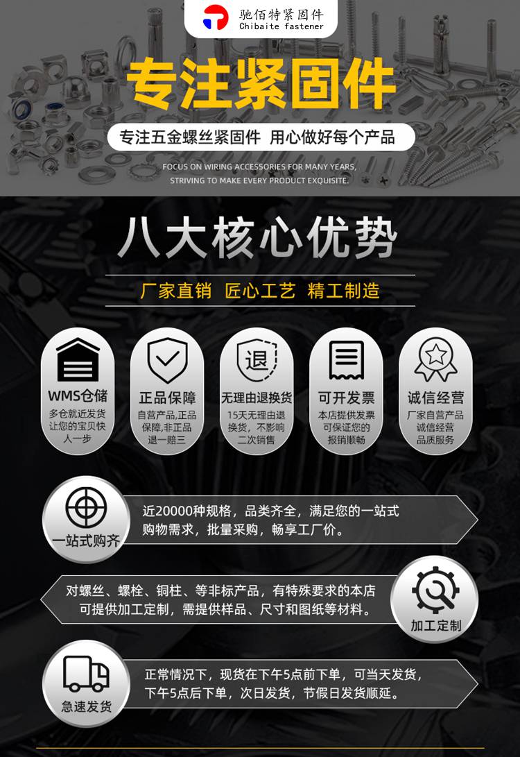河北驰佰特紧固件有限公司,是生产加工的公司,拥有完整、科学的质量管理体系。公司厂房占有5000平方米,员工50余名,6名技术,坐落于河北省邯郸市永年区朱庄工业区。