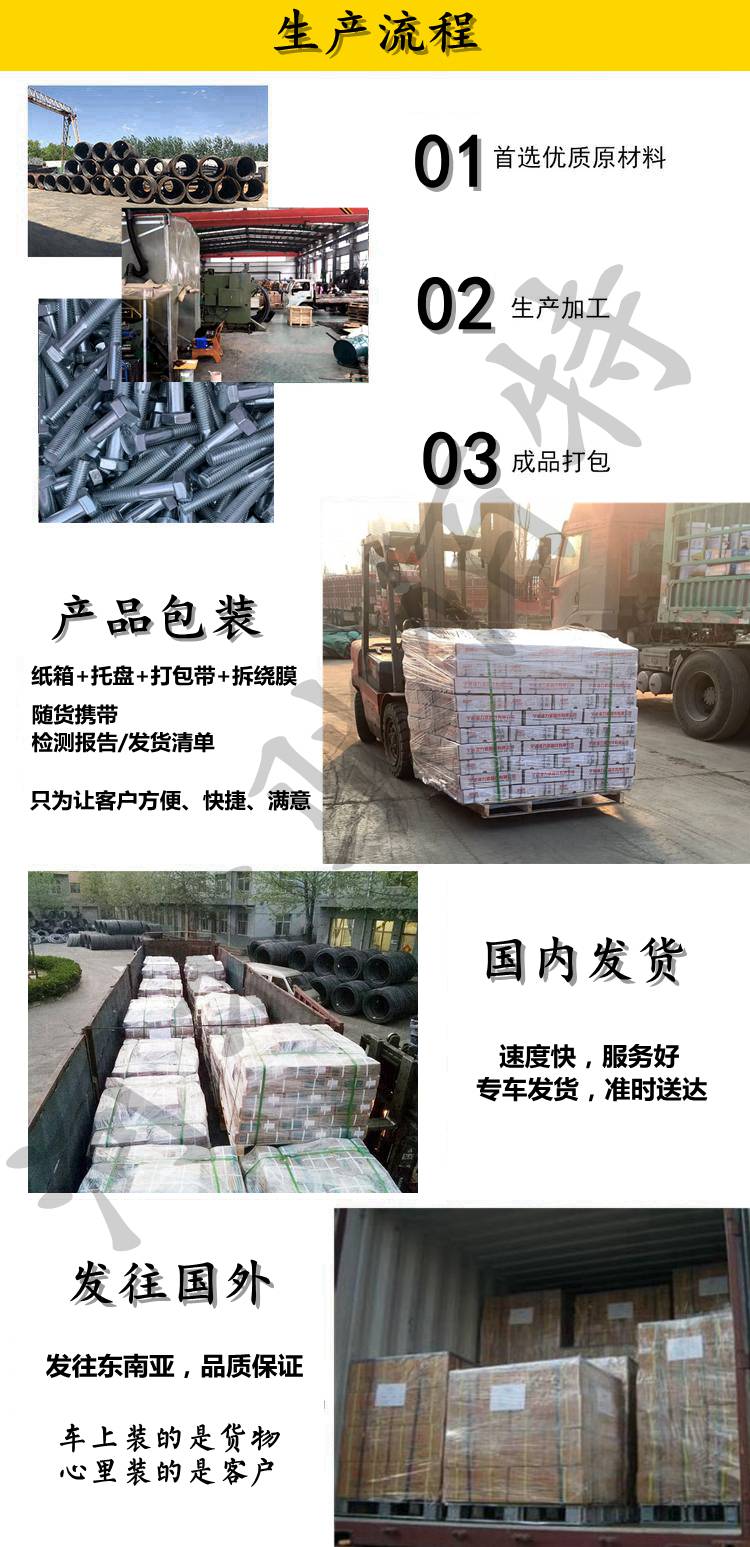 主要生产:4.8级镀锌外六角螺栓、8.8、10.9、12.9级高强度螺栓、细牙/细扣螺栓、英制/美制/A325螺栓、10.9级塔吊螺栓、10.9S钢结构大六角螺栓、10.9S扭剪型螺栓、高强度内六角螺钉、岔枕螺栓、热镀锌螺栓、镀锌螺母、高强螺母、不锈钢螺栓、不锈钢异形件、地脚螺栓、35CrMoA双头螺柱、U型栓、全螺纹螺柱/牙条、对外加工电镀锌、热镀锌等表面处理;来图可定做各种五金冲压件、各种异形件。