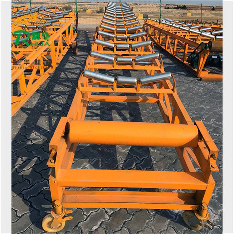 移动式皮带输送机,胶带主要有宽度500、600、650、800mm,1000、1200、1500等特殊规格可以另行设计,皮带输送机是一种连续输送散状物料或成件物品的运输设备,具有结构紧凑,工作、输送量大、生产、操作灵便等优点,运用于港口、码头、车站、仓库、料场、厂矿等地输送煤炭、砂石、粮食、化工原料、成件物品等。输送机配有行走轮,可作整机移动,输送倾角可以根据实际需要调整,倾角为22度,变幅机构可以手动调整,也可以采用电动执行;根据输送工艺布置要求,可以单机或多台组成水平或倾斜的输送系统。