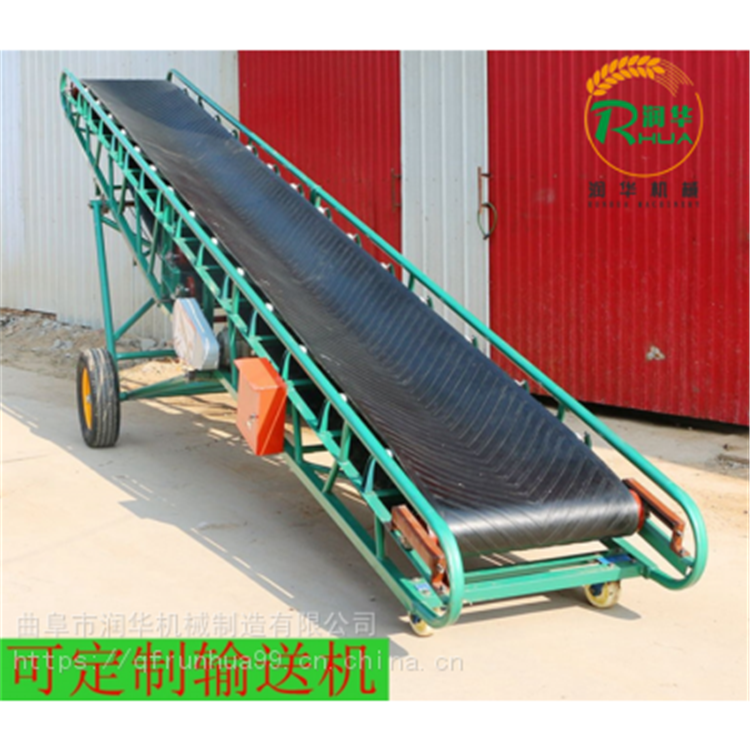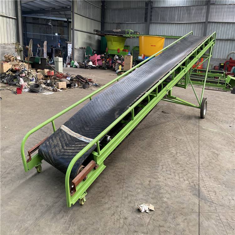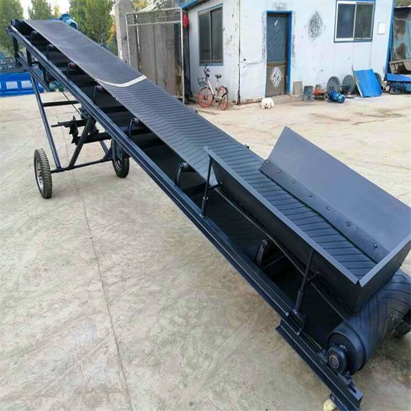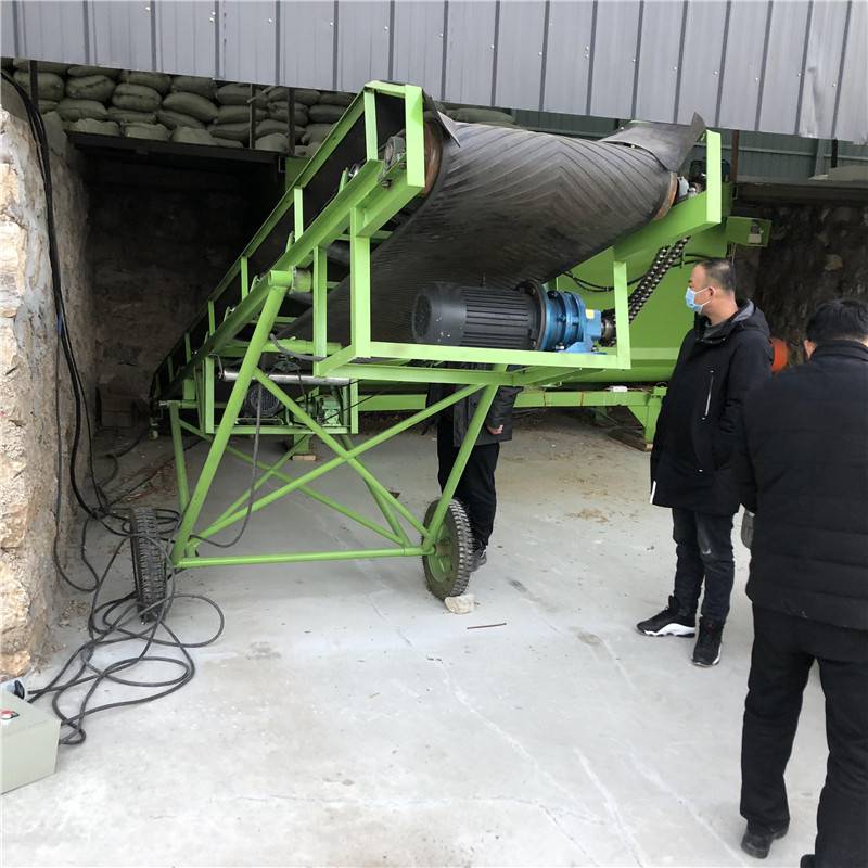 装车卸车用移动带升降皮带输送机不限制使用场地,皮带机下面带有轮子,可来回移动、是一种比较方便的装、卸车用的带式输送机,装卸小麦、玉米、大豆等散装、袋装等不规则物体,升降带移动代替了人工装卸车,了工作效率。