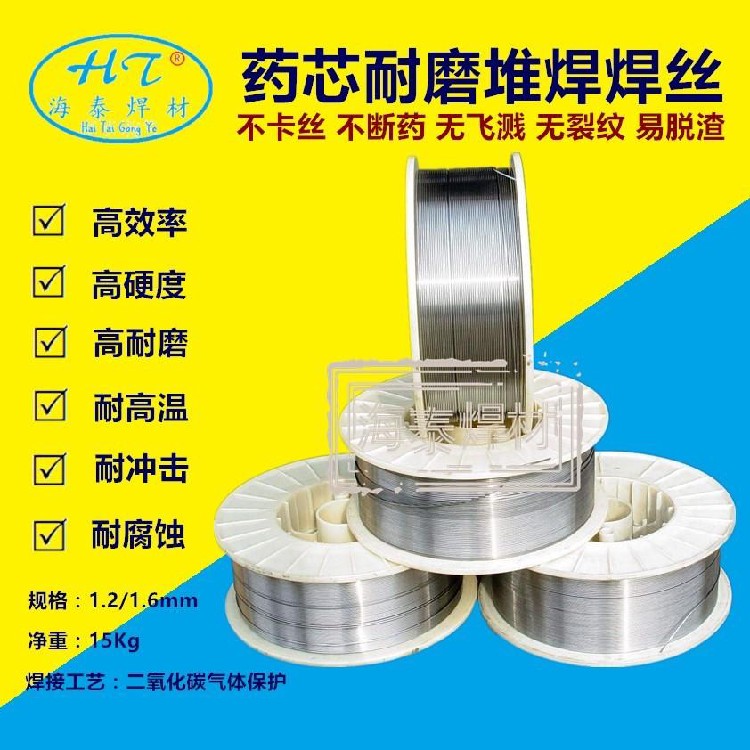 说明: HB-YD628是抗磨粒磨损高碳、高铬铸铁堆焊焊丝。堆焊层为高碳高铬铸铁型弥散碳化物,且堆焊层硬度更高,耐热性能较好,但堆焊层硬而脆,承受压力与冲击载荷的能力较低,为了不影响堆焊层的抗磨粒磨损性能,尽可能采用较小电流,以利于堆焊层硬相结晶的排列方向。 用途:用于堆焊承受轻冲击载荷,但要求具有良好的抗磨粒磨损性能的耐磨表面。如锤击式磨煤机锤头,风扇式磨煤机冲击板等。 堆焊层硬度:HRC≥60 YD642耐磨堆焊药芯焊丝 说明:高铬铸铁堆焊焊丝,堆焊层具有良好的抗气蚀能力。 用途:用于常温和高温耐磨耐腐蚀工作条件的零部件,如水轮机叶片、高压泵零件、高炉料钟等。