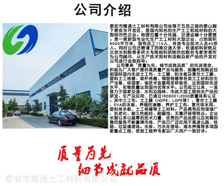 泰安市隆通土工材料有限公司坐落于五岳***的泰山脚下,是国内知名的生产土工和成材料的大型综合性企业。公司现有员工102人,其中工程师10名,技术力量成熟雄厚,同时公司还聘请了西南交通大学、铁道部科研院及北京水科院等多所大专院校科研院所的数名专家学者作为公司顾问,从生产技术到材料选购及新产品的开发对公司进行全面指导。 公司现拥有现代国际***水平的土工布土工膜生产线,防水板及复合土工膜、塑料土工格栅、玻纤格栅、刚塑格栅等各类土工材料生产线。公司成立以来,一直致力于国家交通、水利及园林、市政大型工程相关产品的研发、生产及应用,已通过***:2000质量体系认证。其中土工布、土工膜(HDPE、LDPE等)、复合土工膜、EVA防水板、养殖防渗膜、养护土工布、复合排水网、塑料排水板、土工格栅等土工材料。