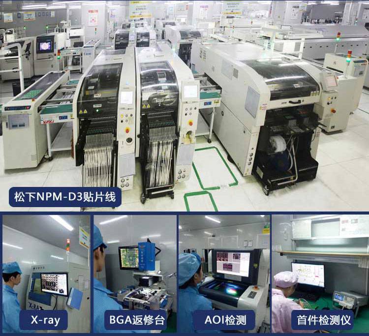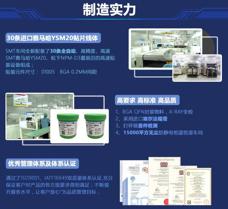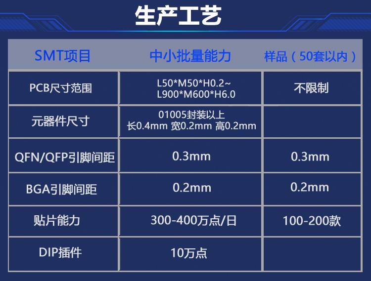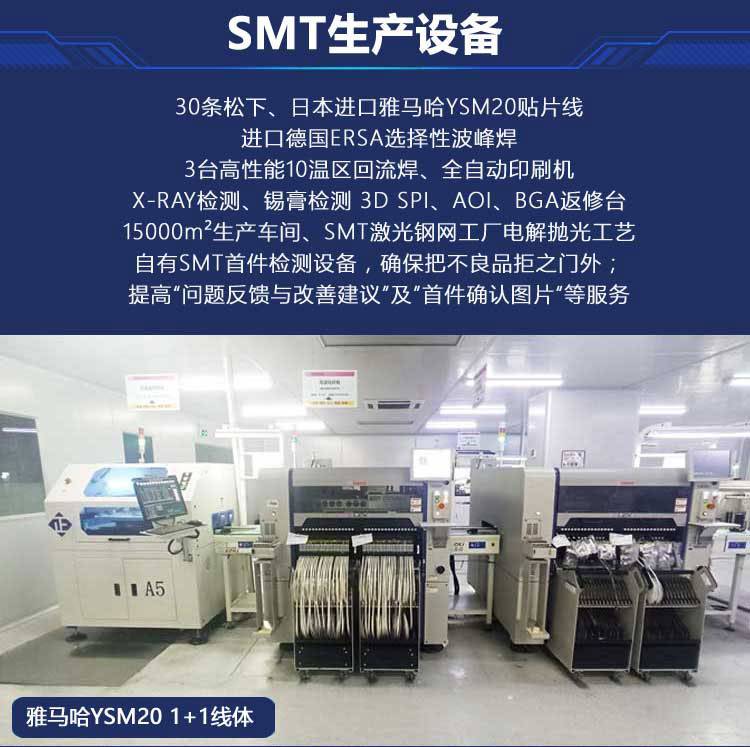 全程机贴,24H交货,加急8H; 2.免工程、钢网、开机费用;3.打样50套内送阻容;我司SMT贴片封装小可贴装01005高难度物料、CPU BGA焊盘小达至0. 2MM间距,井配X-RAY检测:QFP/QFN 0. 3MM间距PCB尺寸,50*50小于该尺寸也可以贴装,只需开取治具即可;建议尽量拼板+5MM的工艺边:PCB尺寸810长*490宽;工序可做SMT+DIP+压接f烧录+测试+组装 +喷三防-激光打标贴片线体:30条打样线 雅吗哈 YSM20 单线产能60万点/天DIP:4条全自动波峰焊接,1条选择性波峰焊;组装线体1条。回流焊:劲拓 上下十温区 双轨道+链条AOI:神州视觉X-RAY:日联科技
