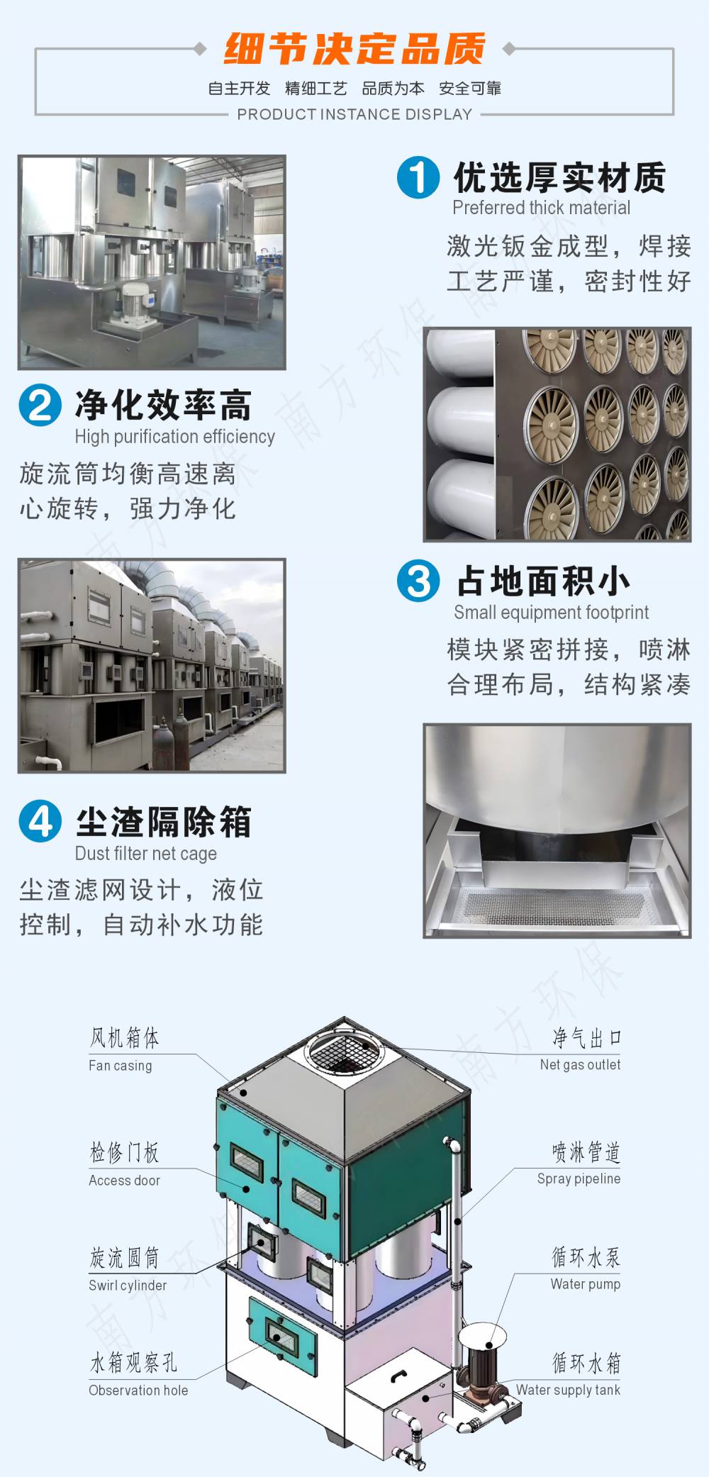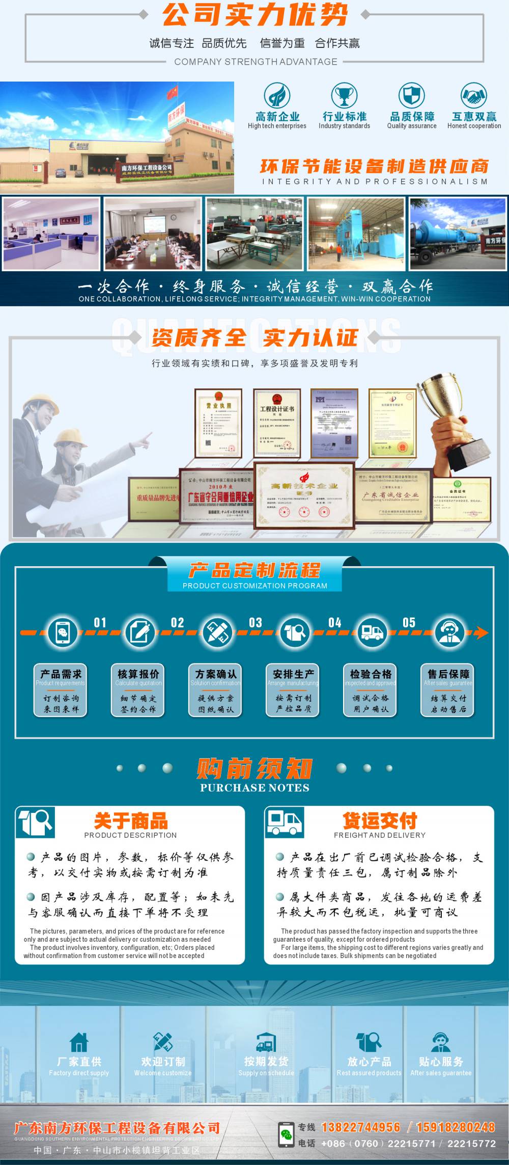 【广东南方环保工程设备有限公司】始创02年,执行“精心设计、精心制造、精心管理”运作机制,致力环保节能设备,治理工艺设计解决方案;结合现代治理技术,为用户提供切实可行、可具实效的成套设备及工艺,集工程设计、研发制造、销售服务等为一体企业,能胜任各类环保工程项目总承包任务及从业管理资质。 【技术支持】:现有标准厂房及办公近3仟方,设有设计,研发,制造,售后等服务部门,具环保、机械、电气及安装等技术人才和施工力量,生产设备齐备,产品质量可靠;具“工程设计证书”资质,荣获“重合同守信用企业”、“广东省诚信企业”、“重质量品牌单位”等称号,享有多项盛誉及发明证书,在环保领域有多项实绩案例,品质服务颇受用户信赖与好评; 【诚信合作】:遵循环保工程设备操作程序及设计规范要求,以实用性、经济性为核心,确保在技术领域不断推陈出新、在工艺设计更符合市场需求,使“南方环保/south”品牌让用户放心,安全的服务机构,不断增强公司市场竞争力; 【产品服务】:工业集尘,除尘回收,烟气脱硫,废气净化,通排风设备,配件耗材等;设计制造,施工安装,技术支持等配套服务; 20年品牌见证,出色源于专注!欢迎您光临指导,共创双赢合作!