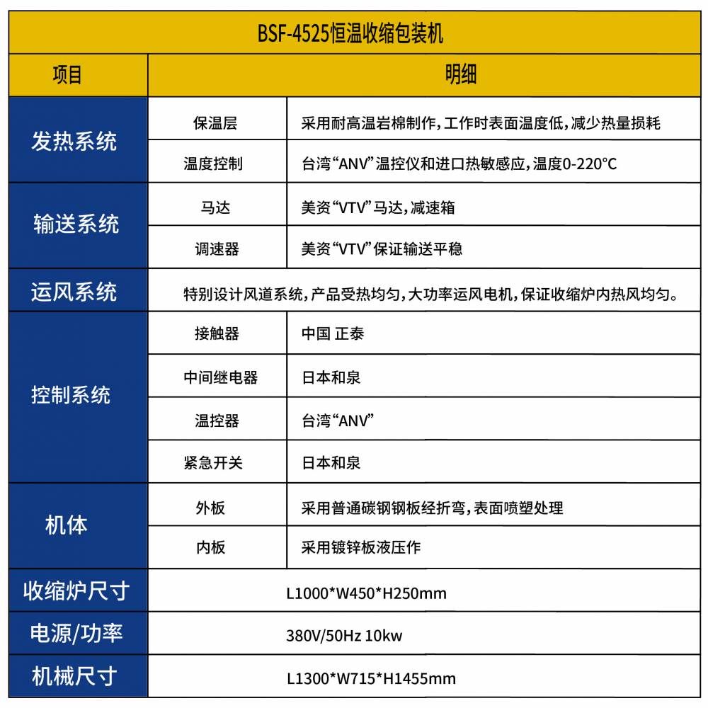 采用电子调速器调速,可以任意调整输送速度,以确保输送的平稳性及良好的收缩效果;数显电脑智能控温,温差小;运行稳定、低噪音、寿命长;优质不锈钢发热管,内部双向热循环风,热量均匀、恒定;包装之后的产品能密封、防潮、防撞击,适用于多件物品裹紧包装和托盘包装。