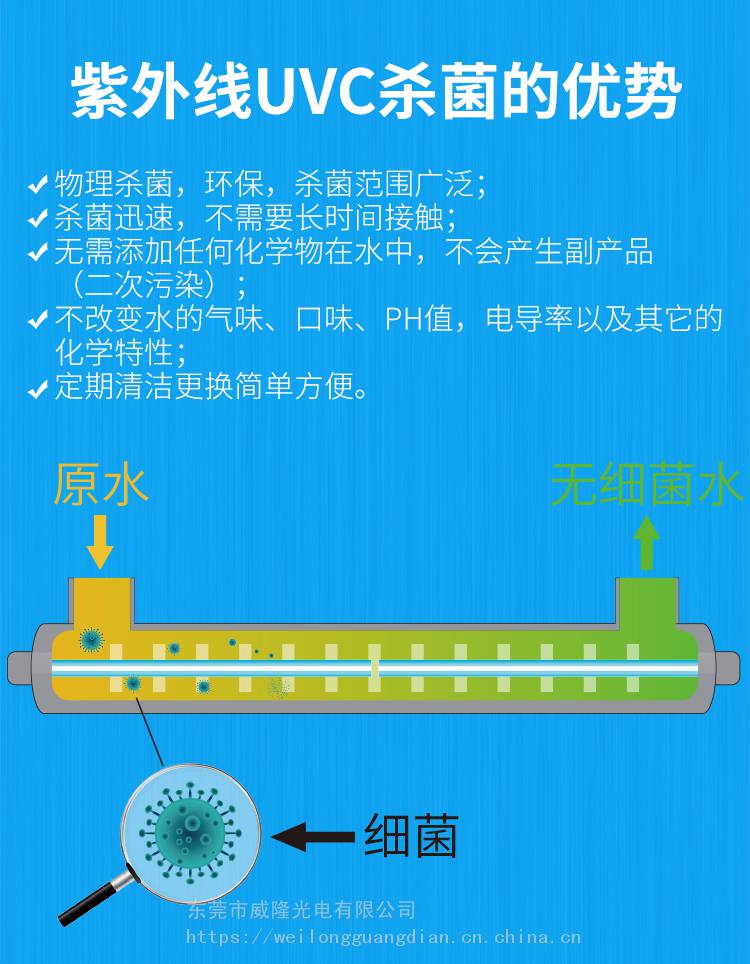 2、紫外线杀菌属于物理方法,不会对水体和周围环境产生二次污染;