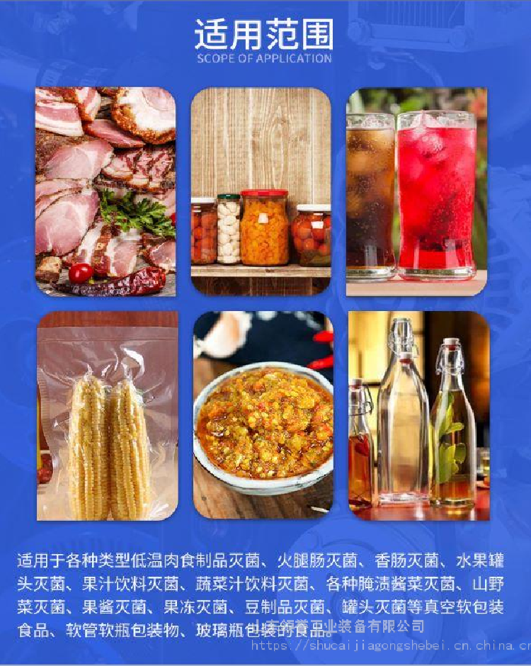 该设备可适用于软包装蔬菜、低温肉制品、休闲食品、罐头类、玻璃瓶装、腌渍菜类、调料包,果冻以及啤酒业,还应用于保鲜奶、巴氏奶、酸奶、果汁、茶饮料、葡萄酒、冰淇淋、乳饮料、果酱、酱制品等产品的无菌生产等产品进行100°C以下低温(沸水)连续杀菌及冷却。