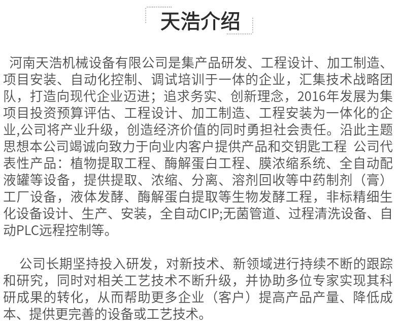 河南天浩机械设备有限公司是集产品研发、工程设计、加工制造、项目安装、自动化控制、调试培训于一体汇集技术战略团队,打造向国际化现代企业迈进;追求务实、创新理念,并与多所高校、研发院所签署创新技术合作。2016年发展为集项目投资预算评估、工程设计、加工制造、工程安装为一体化的中型企业 公司代表性产品:反应釜、无菌洁净罐、发酵罐、动态提取罐、酶解罐、浓缩器、全自动配液罐等设备,提供提取、浓缩、分离、溶剂回收等中药制剂(膏)工厂设备,液体发酵、固体发酵等微生物发酵工程,非标精细生化设备设计、生产、安装,全自动CIP;无菌管道、过程清洗设备、自动PLC远程控制等。公司长期坚持大量资金投入研发,对新技术、新领域进行持续不断的跟踪和研究,同时对相关工艺技术不断升级,并协助多位专家实现其科研成果的转化,从而帮助更多企业(客户)提高产品产量、降低成本、提供更完善的设备或工艺技术。 公司将通过体系创新争做行业标准制定者,进而***产业升级,创造经济价值的同时勇担社会责任。沿此主题思想本公司竭诚向致力于行业研究的专家学者提供***的研发实验设备,向业内客户提供***的产品和交钥匙工程。