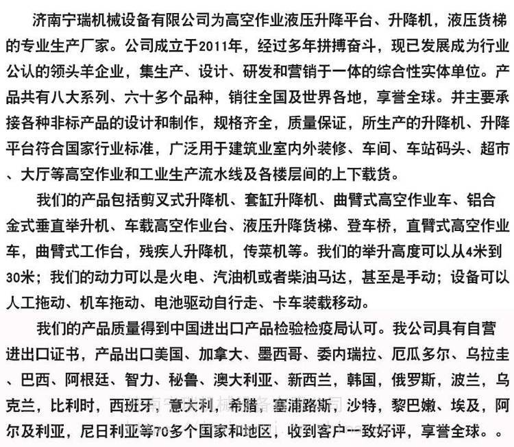 宁瑞公司为高空作业液压升降平台、升降机,液压货梯的专业生产厂家。公司成立于2011年,经过多年拼搏奋斗,现已发展成为行业公认的***企业,集生产、设计、研发和营销于一体的综合性实体单位。产品共有八大系列、六十多个品种,销往全国及世界各地,享誉全球。并主要承接各种非标产品的设计和制作,规格齐全,质量***,所生产的升降机、升降平台符合国家行业标准,广泛用于建筑业室内外装修、车间、车站码头、超市、大厅等高空作业和工业生产流水线及各楼层间的上下载货。 我们的产品包括剪叉式升降机、套缸升降机、曲臂式高空作业车、铝合金式垂直举升机、车载高空作业台、液压升降货梯、登车桥,直臂式高空作业车,曲臂式工作台,残疾人升降机,传菜机等。我们的举升高度可以从4米到30米;我们的承载能力可以从100公斤到100吨;我们的动力可以是火电、汽油机或者柴油马达,甚至是手动;设备可以人工拖动、机车拖动、电池驱动自行走、卡车装载移动,我们产品通过多项行业认证,产品质量得到中国进出口产品检验检疫局认可。