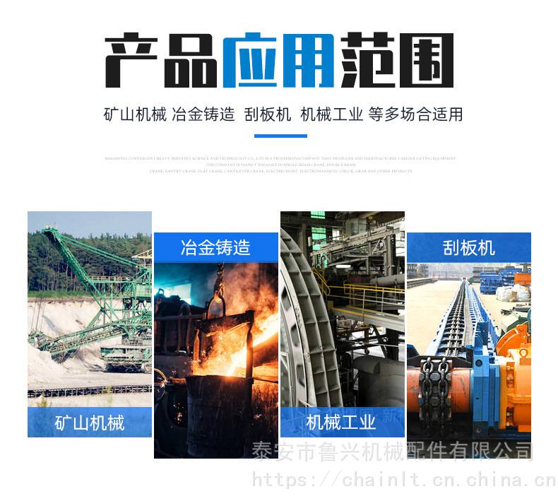 我公司位于五岳***的泰山脚下,南临一代圣人孔子故里曲阜,京沪高速、铁路干线环绕周边。人文地理位置得天独厚,巍峨壮丽的泰山打造了我公司的厚重与诚信。愿与国内外广大新老客户广泛合作,共谋发展,为您的事业增辉添彩、创造辉煌。? 产品明细说明: 1.高强度链条、G80起重链条、起重链条、G70链条,g43级链条,链条成套吊索具,电磁吸盘链条,刮粪机链条,单轨吊链条,不锈钢链条。 2.矿用高强度链条、链轮、刮板、连接环、中部槽、弧齿环,马蹄环,锯齿环,矿车三环链,矿用扁平链,矿用紧凑链 等。 3.NE提升机链轮,链轮总成,提升机用7环9环圆环链条、链轮、料斗、链钩等提升机配件,NE板式提升链条,NSE高度提升链,FU板式输送链条、DS倾斜输送链条。 4.护栏链条、护栏铁链,塑钢链条,圆环铁链、装饰链条、绿化链条,吊桥链条等 5.船用锚链、渔网链、船用有档锚链、捆扎链、绑扎链条,船盖链、舱盖链、舱盖链专用连接环、浮标锚链、码头链,船用小链。 6.、锅炉除渣机链条、电力捞渣机高强度圆环链条、链轮、双孔、四孔连接环、锯齿连接环 7.美标NACM96链条、美标NACM84/90链条、美标ASTM80链条、德标DIN766链条、德标DIN763链条、德标DIN764链条、德标DIN5685链条、德标DIN5687/5688链条、英标短环、中环、长环链、EN818-2链条、澳标链条、挪威标准链条、韩国标准链条。 8.、起重D型环、马蹄环、非标焊接单环、梨形环、圆环、索具配件 9 本公司还可根据用户需求定做生产各种规格的异型产品,欢迎来电来函咨询泰安市鲁兴机械配件有限公司具有国内外***水平的链条设计开发及全自动链条生产线设备和技术。长期以来,本公司坚持“实施品牌战略,超越顾客希望,持续质量改进,靠信誉求发展”的质量信誉方针,使产品的品质档次大大提高,***不断增长,产品销售全国各地。近几年来相继出口到俄罗斯、美国、德国、加拿大、英国、日本、土耳其、比利时、印度、越南、欧洲、中东等地区,赢得国内外广大用户的信任与支持,在市场上享有很高的信誉,是省级合同守信用企业,山东省对外贸易进出口的***。