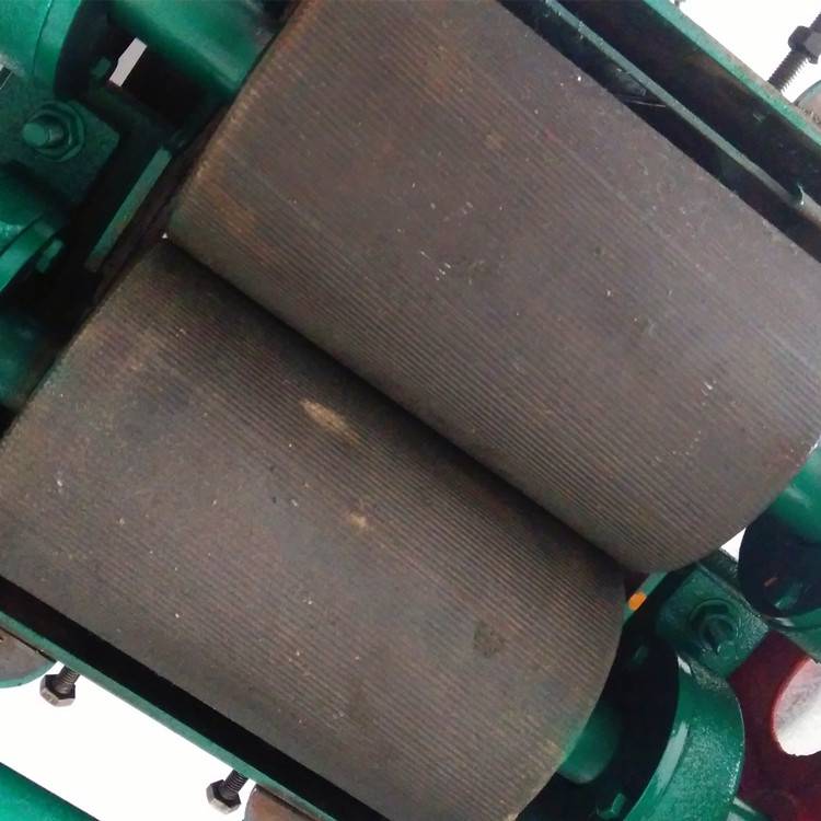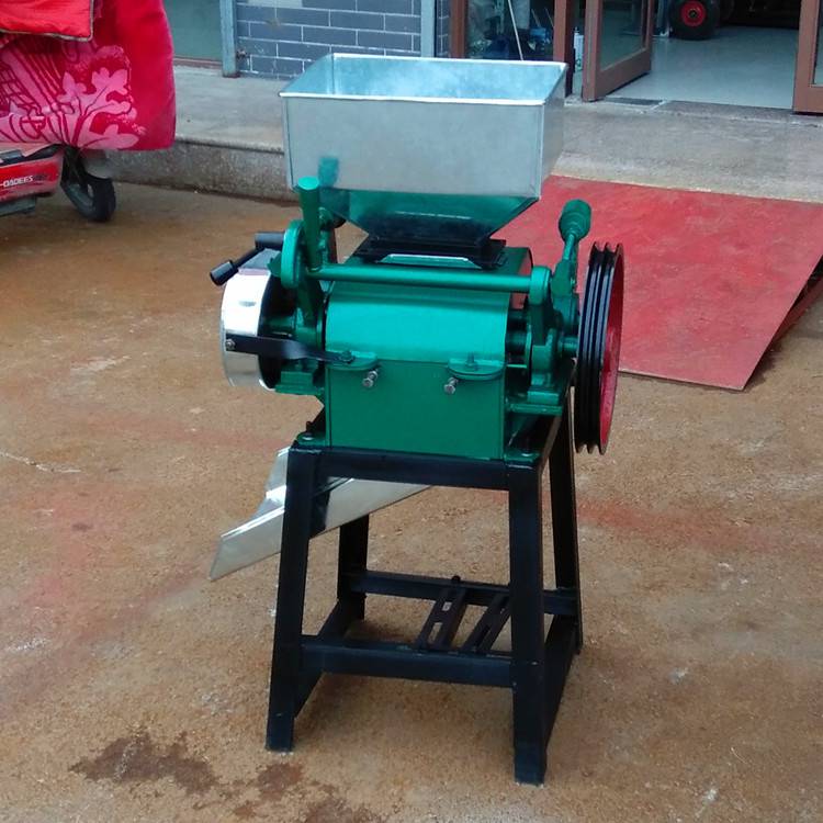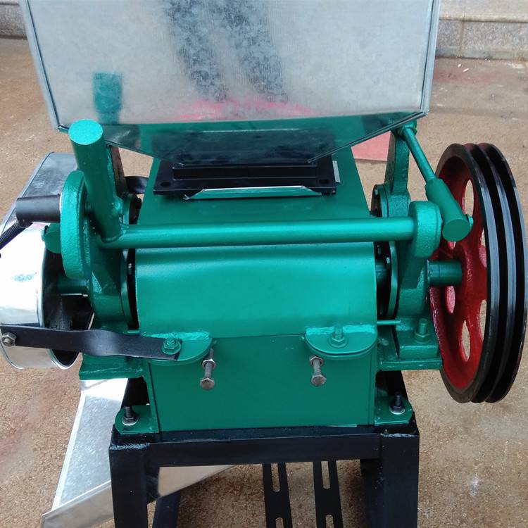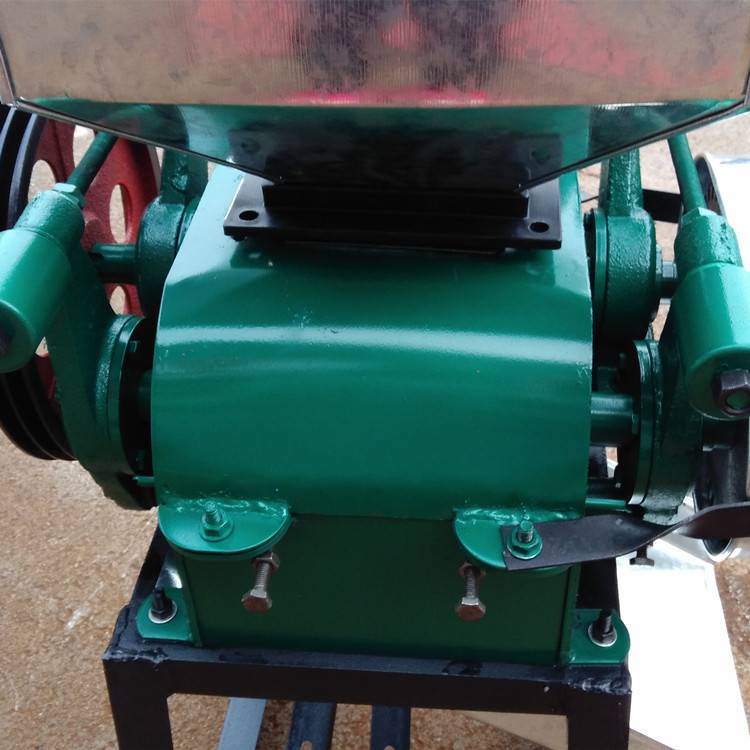 物料通过与本机相配的进料斗由顶部进料口喂入,经锰钢对辊互相挤压成为颗粒状,从底座出料口排出。机器前段有大螺丝手把可随意调节粮食物料的大小颗粒程度,达到客户满意的口感效果!