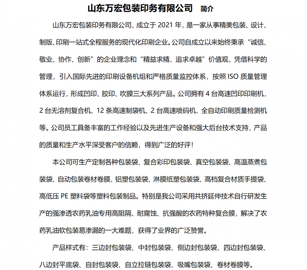 山东万宏包装印务有限公司成立于2021年,是一家从事精美包装、设计、制版、印刷一站式全程服务的现代化印刷企业。公司自成立以来始终秉承“诚信、敬业、协作、创新”的企业理念和“精益求精、追求***”价值观,凭借科学的管理,引入国际***的印刷设备机组和严格质量监控体系,按照***质量管理体系运行,形成凹印、胶印、吹膜三大系列产品。公司拥有4台高速凹印印刷机,2台无溶剂复合机、12条高速制袋机、2台高速喷码机、全自动印刷质量检测机等。公司员工具备丰富的工作经验以及***生产设备和强大后台技术支持,产品的质量和生产水平深受客户的信赖,得到广泛的好评! 本公司可生产定制各种包装袋、复合彩印包装袋、真空包装袋、高温蒸煮包装袋、自动包装卷材卷膜、铝塑包装袋、淋膜纸塑包装袋、***复合材质手提袋、高低压PE塑料袋等塑料包装制品。特别是我公司采用共挤延伸技术自行研发生产的强渗透农药乳油专用高阻隔、耐腐蚀、抗强酸的农药特种复合膜,解决了农药乳油软包装易渗漏的一大难题,获得了***的广泛赞誉。 产品广泛应用于: 【食品类:休闲食品包装;膨化食品包装;油炸食品包装;干果坚果包装袋;茶叶类包装;阿胶产品包装;大枣红枣类包装;速冻类食品包装;海鲜水产类包装;糖果/巧克力类包装;烘培食品类包装/糕点/面包/饼干/月饼;面粉类包装/面条挂面/水饺汤圆/包子/粽子;咖啡/奶茶/奶粉/豆奶粉/核桃粉/燕麦片/固体饮料/固体冲调冲剂;干货类产品包装;粉丝粉条类包装;调料类包装/酱料产品包装;五谷杂粮类包装/大米小米包装;酱菜/榨菜类包装;肉制品真空包装;甜糯玉米包装;豆制品类包装;牛肉干/奶制品类包装;各地特产食品包装;等···】 【农业类:玉米种子、蔬菜种子、菜籽、肥料、农YAO、花卉肥料、营养土 等】 【工业类:腻子粉、胶粉、堵漏王、填缝剂、化工、各类添加剂 等】 【畜牧类:兽YAO饲料、宠物食品、宠物用品、鱼饵鱼食、饲料添加剂类、等】 【生物类:BAO健品、暖贴、面膜、梨膏冲剂 等】 【日常用品类:洗衣粉、洗衣液、纸巾、湿巾、肥皂香皂类 等】 【医LIAO医YAO类:口罩包装、中药饮片、膏YAO贴 等】等···需要包装的各行各业。 ? 各种塑料包装产品都可以根据客户要求免费排版设计! 公司已通过质量安全生产许可等相关认证!