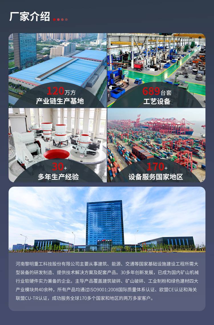 河南黎明重工科技股份有限公司创立于1987年,主要从事建筑、能源、交通等国家基础设施建设工程所需大型装备的研发制造、提供技术解决方案及配套产品。30多年创新发展,已成为国内矿山机械行业软硬件实力兼具的企业。主导产品覆盖建筑破碎、矿山破碎、工业制粉和绿色建材四大产业模块共30余种,所有产品均通过***:2008国际质量体系认证、欧盟CE认证和俄罗斯GOST质量认证,成功征服全球130多个国家和地区的两万多家客户。 公司总部坐落于传统与创新交融的郑州国家高新技术产业开发区,面积80000平方米左右,位于上街的机械装备工业园占地67000平方米。30多年春华秋实初心不变,我们怀揣着振兴民族工业的赤诚理想,坚守着做破磨行业品质追求者的品牌定位。黎明重工,为改变矿山机械而精工智造!