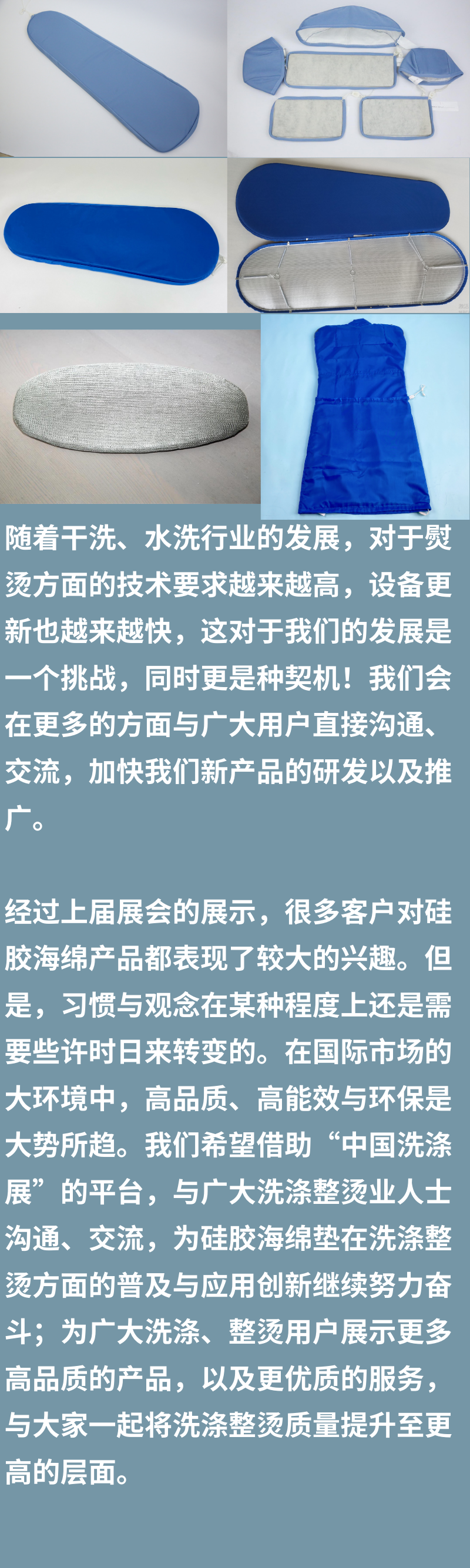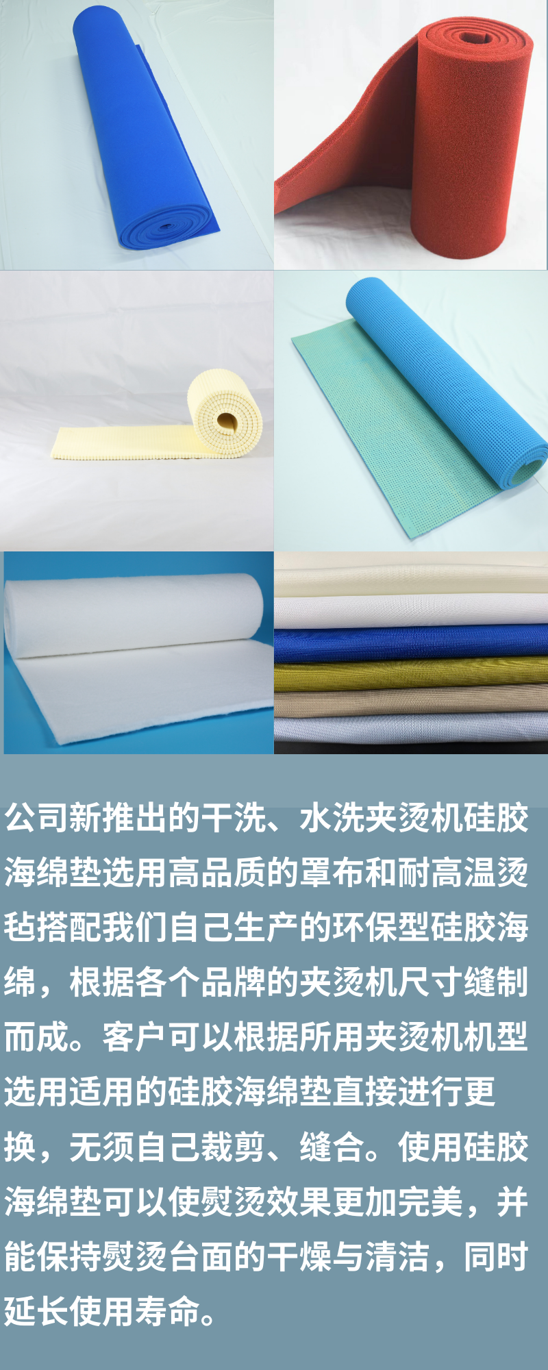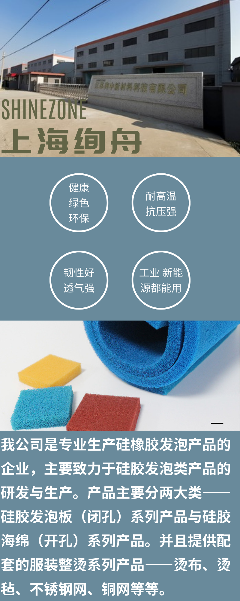 ?我公司是生产硅橡胶发泡产品的企业,主要致力于硅胶发泡类产品的研发与生产。产品主要分两大类——硅胶发泡板(闭孔)系列产品与硅胶海绵(开孔)系列产品。并且提供配套的服装整烫系列产品——烫布、烫毡、不锈钢网、铜网等等。 ? ? ? ?我公司生产的硅胶海绵(开孔)系列产品具有透气性好、耐压性强等优点,是西服及各种服装整烫生产的需要的产品。硅胶发泡板(闭孔)系列产品具有发泡均匀、耐压性能好,其中新研制开发的针孔浮点硅胶发泡板解决了一般产品的浮点不饱满的技术难题,一般产品的浮点不饱满,容易挡住透气孔,造成吸风效果不良。我司的产品具有更好的透气性和回弹性,以及***时间的试用寿命。 ? ? ? ?根据不同的服装整烫生产工艺,我们研发、生产的硅胶类产品品种繁多,并可依据客户的需求进行定制生产,热诚欢迎国内外新老客户惠顾!