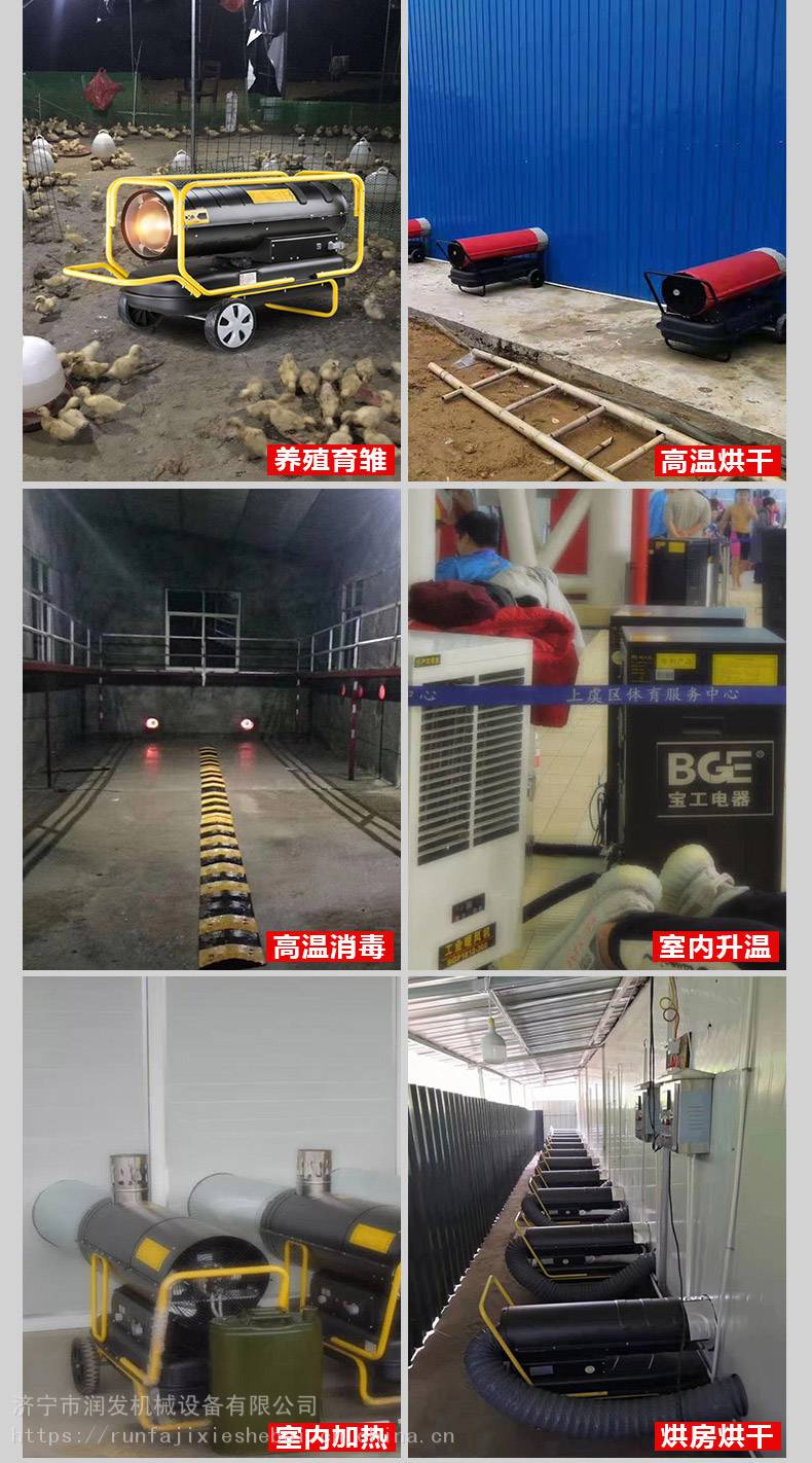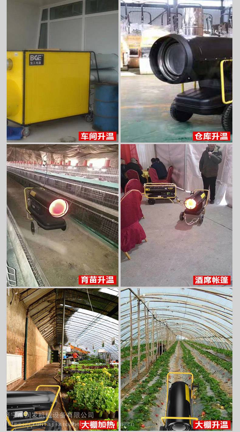 施工场所的临时加温干燥;养殖场所的临时加温或者补充加温;厂房的加温供暖;发动机、机器预热基建、地坪施工、内装施工的临时供热;抢险施工的紧急加温;农业供暖干燥等。直燃型热风机,燃料为柴油或者煤油;气体雾化燃烧,燃烧效果好;强制热风型加热,加温迅速。