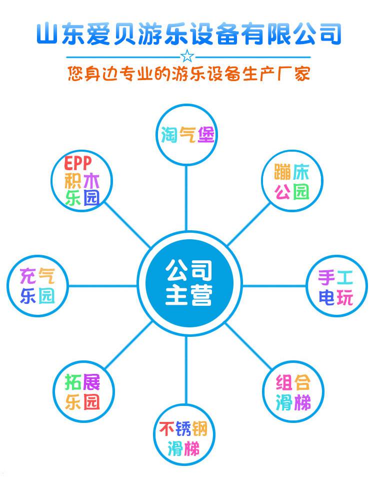 本司主要有大型游乐设施、组合滑梯、水上游乐设施、淘气堡、安全地垫、幼儿园配套玩具以及公园、商场、会所等游乐设施,拓展设备等上千种产品。