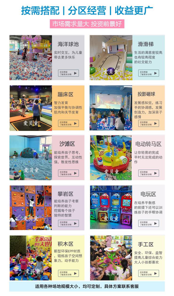 淘气堡儿童乐园是越来越流行,可谓是***国内儿童游乐市场。在诸多经营儿童乐园的投资者当中,很多人赚得个盆满钵满.那么室内儿童淘气堡该如何经营。才能让自己的淘气堡儿童乐园发挥好的经营效益呢?淘气堡儿童乐园的装潢。装潢装饰目标便是为了展现现象,人们经过现象展现看定位,既然是儿童淘气堡游乐园,固然是要送上人以轻活、活跃、乖巧的现象。