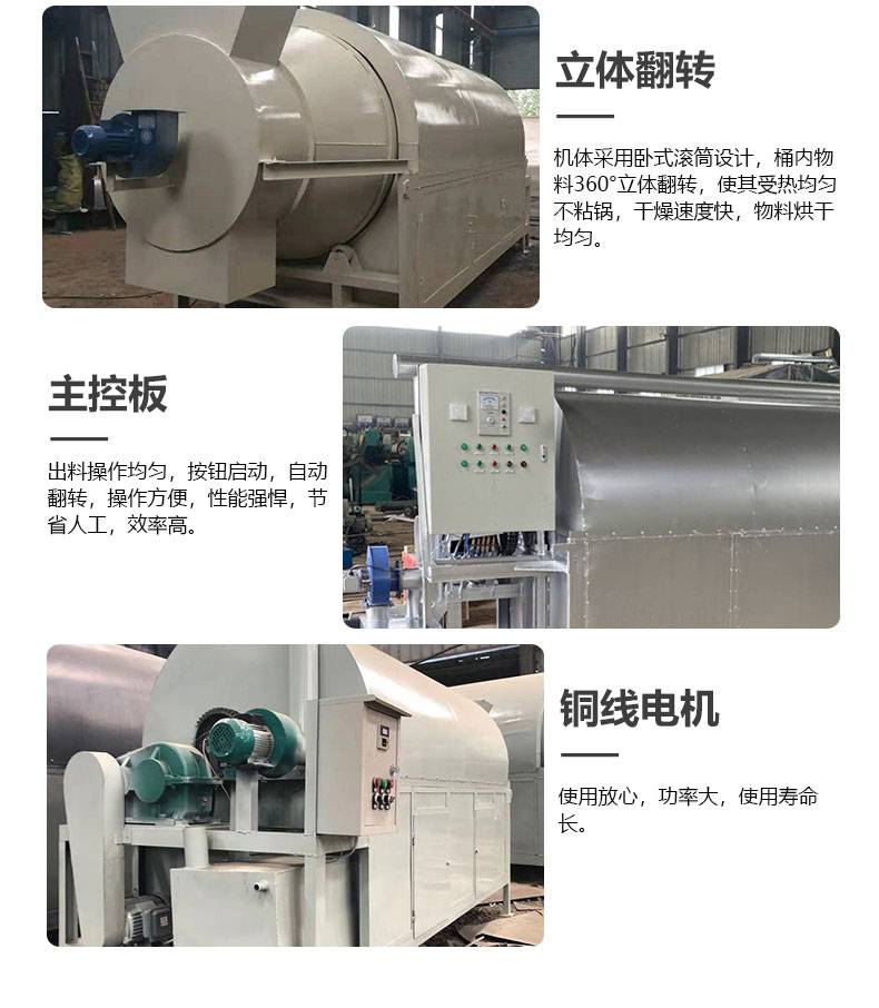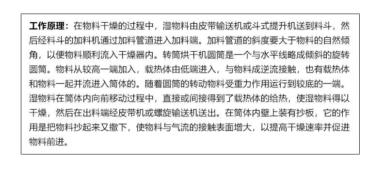2:以热空气作为干燥介质,采用回转对流烘干工艺,物料受热降水均匀、烘干后品质好。