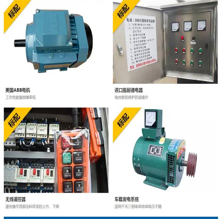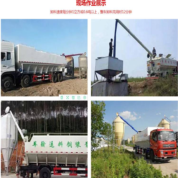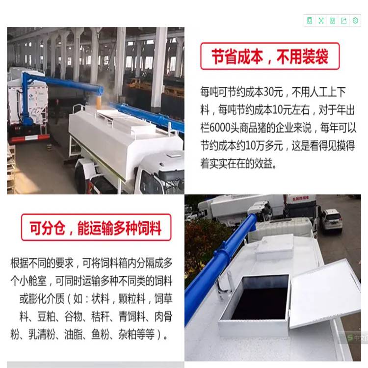 箱体配置:罐体材质采用优质碳钢板(约65方,整车自重10.2吨),整车4条绞龙,有4个5.5KW电机带动,德力西电控箱,遥控,顶部绞龙液压控制举升,可左右旋转180°,罐体5个独立分仓,可独立控制各分仓卸料顺序和速度,卸料管倾斜60-70度,垂直卸料高度8.5米,整车卸料完用时35-40分钟。