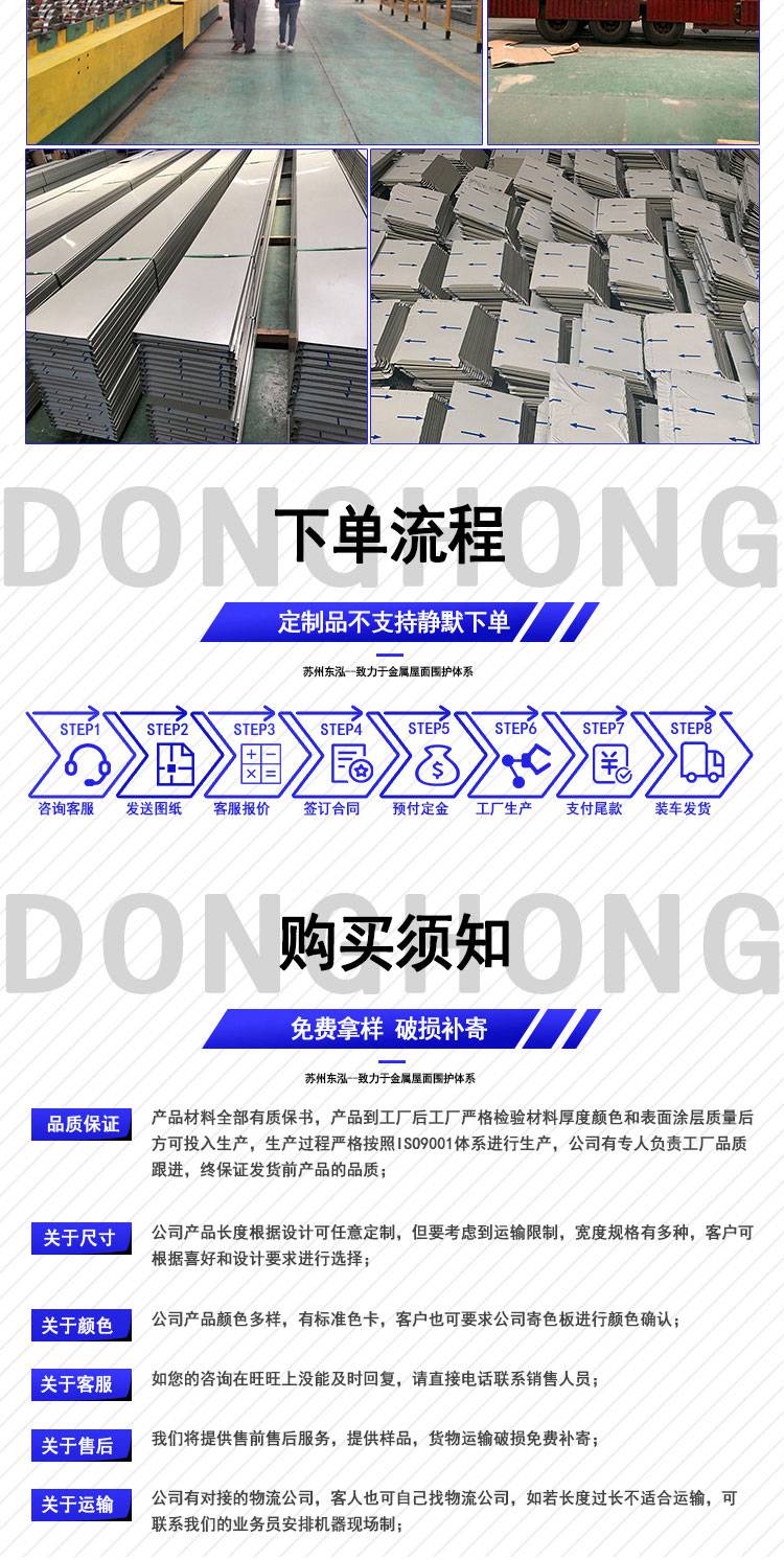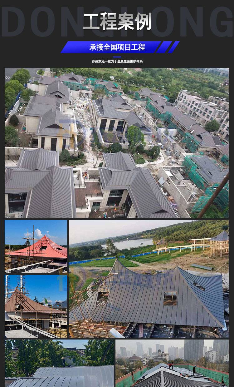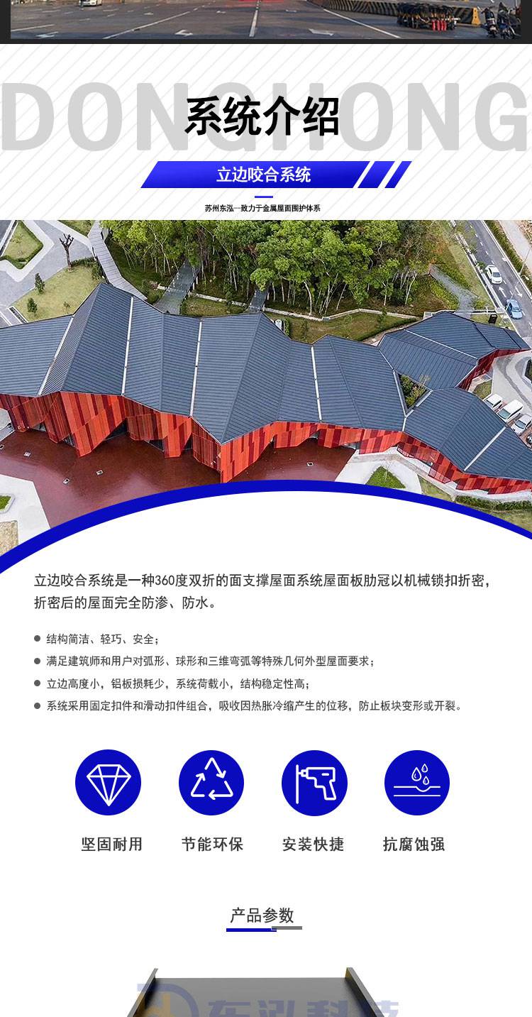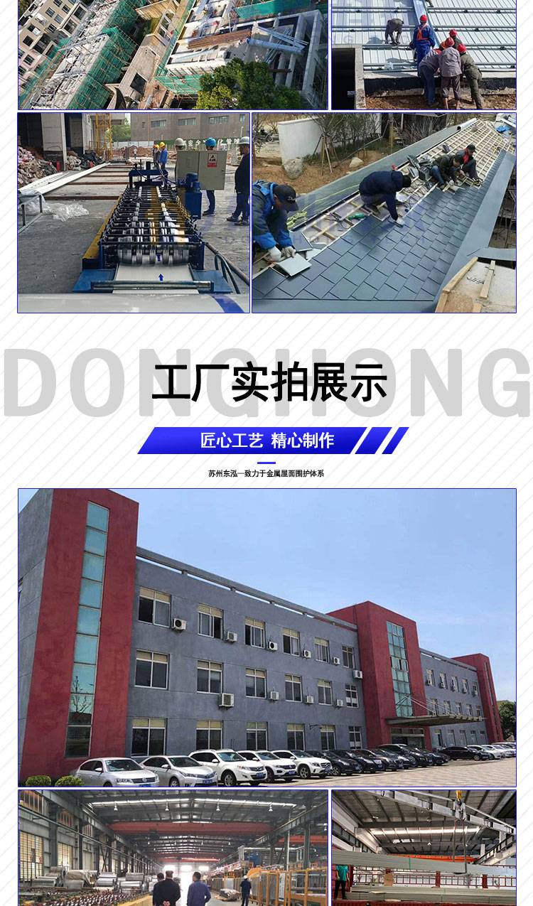 苏州东泓金属材料科技有限公司(Sunzhou Donghong Metal materials technology co. LTD)坐落于美丽的“德企之乡”苏州太仓,公司紧靠国家钢结构产业基地上海,与建筑之都南通一江之隔,交通发达,物流便捷。公司专业从事金属屋面、墙面材料的研发、制作、加工生产及销售安装,主营直立锁边铝镁锰屋面系统、金属幕墙系统、平锁扣屋面围护系统、仿古金属琉璃瓦系统、外墙保温系统以及金属暗扣式筒瓦屋面系统。公司从事多年压型钢板和直立锁边金属屋面墙面系统专业的高素质技术人员,拥有成熟丰富的现场施工项目管理经验,强大的技术设计团队,专业精细图纸深化,现已与国际、国内知名的高品质材料供应商建立了紧密的合作关系,可同时为全国建筑开发商、建筑师、工程公司、材料分销商提供全面的设计深化与咨询、材料供应、施工安装、售后维护等一条龙服务。 “东来紫气,泓扬四海”,公司一直以来严抓产品质量,重视产品研发和企业品牌建设,以“创***企业,树***”为宗旨,致力成为金属屋面围护系统专家,以***的品质、优良的服务为客户创造价值。