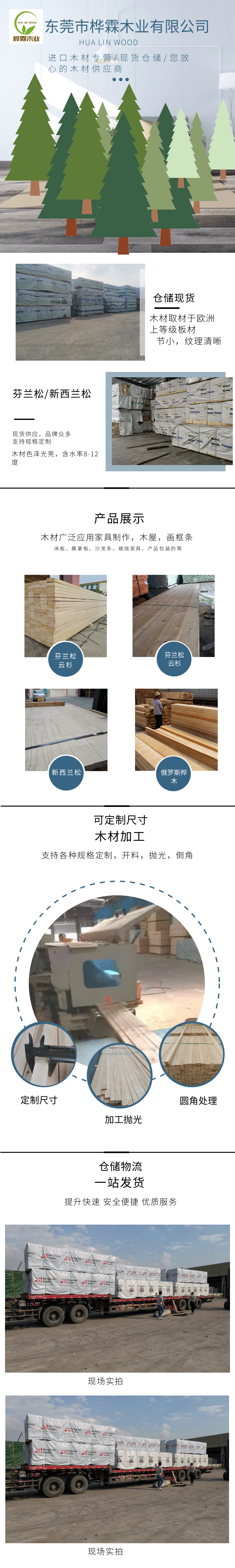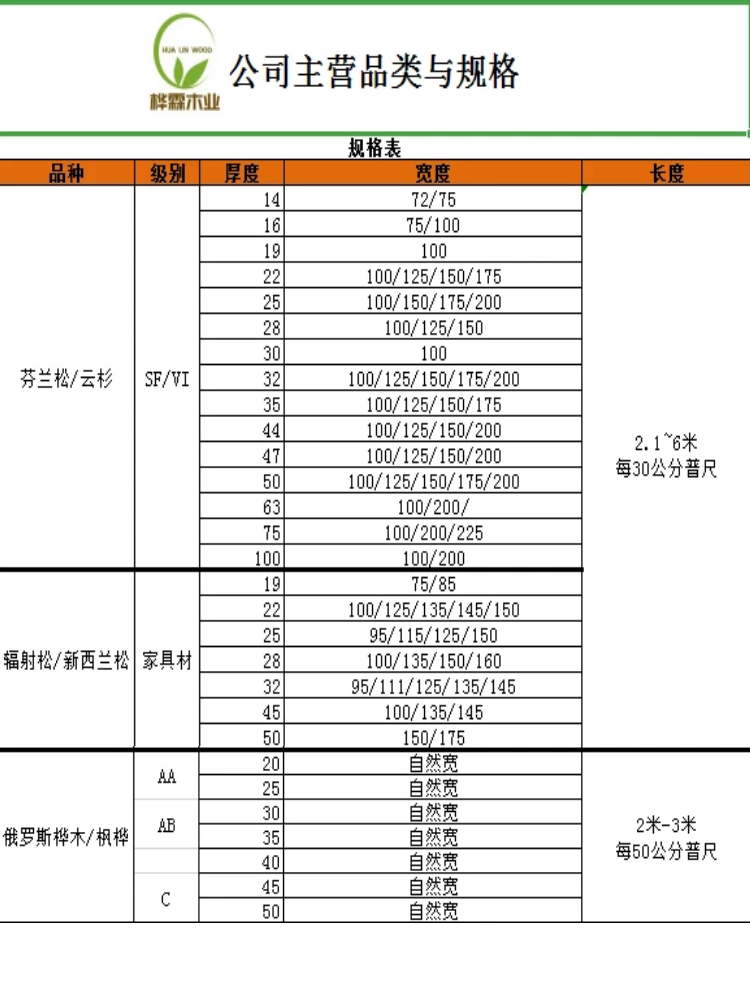 东莞市桦霖木业有限公司自成立以来,坚持以仓储现货木材一站式发货批发,可以满足客户更多的需求。 公司拥有配套仓储服务与及销售团队,在厚街 大岭山均设有仓库,实现长期稳定快速供应服务。 主要经营产品有:进口松木,新西兰松木,乌拉圭松木,芬兰松,俄罗斯桦木等。板材等级多种,应用于家具、木门窗、橱柜、地板、工艺品及各种木制品,包装。 公司产品板材生产过程中采用的锯切、烘干工艺均由电脑控制的蒸汽干燥程序完成,含水率保持在8-12%,计算机中控台的***检尺,机械化的包装,分等标准严格按照美国阔叶木协会(NHLA)制定的行业标准,具有可持续发展性、品质稳定、分等规范、无大小头、不易变形的优势,是众多木制品生产企业原材料的上佳之选。我司更在意你的个性化需求,还可提供特殊规格材料,为你定制你生产中合适的长度,生产中您拿来就能用,不用再选材,还能为你节省材料成本。都是直接来自从国外各大林场、并一手筛选过的、品质稳定。专注做大自然的搬运工,更做你的实木板材采购顾问,了解清楚你的所需,并全程一对一跟进使用情况。公司坚持,重信用、守合同、***产品质量,以客户放心满意为宗旨和薄利多销的原则,赢得广大客户的信任并与之建立良好合作伙伴关系。我们坚信有良好的品质、和负责到底的态度才会让客户放心,所以,我们的目的只有一个:做让你放心的木材供应商!